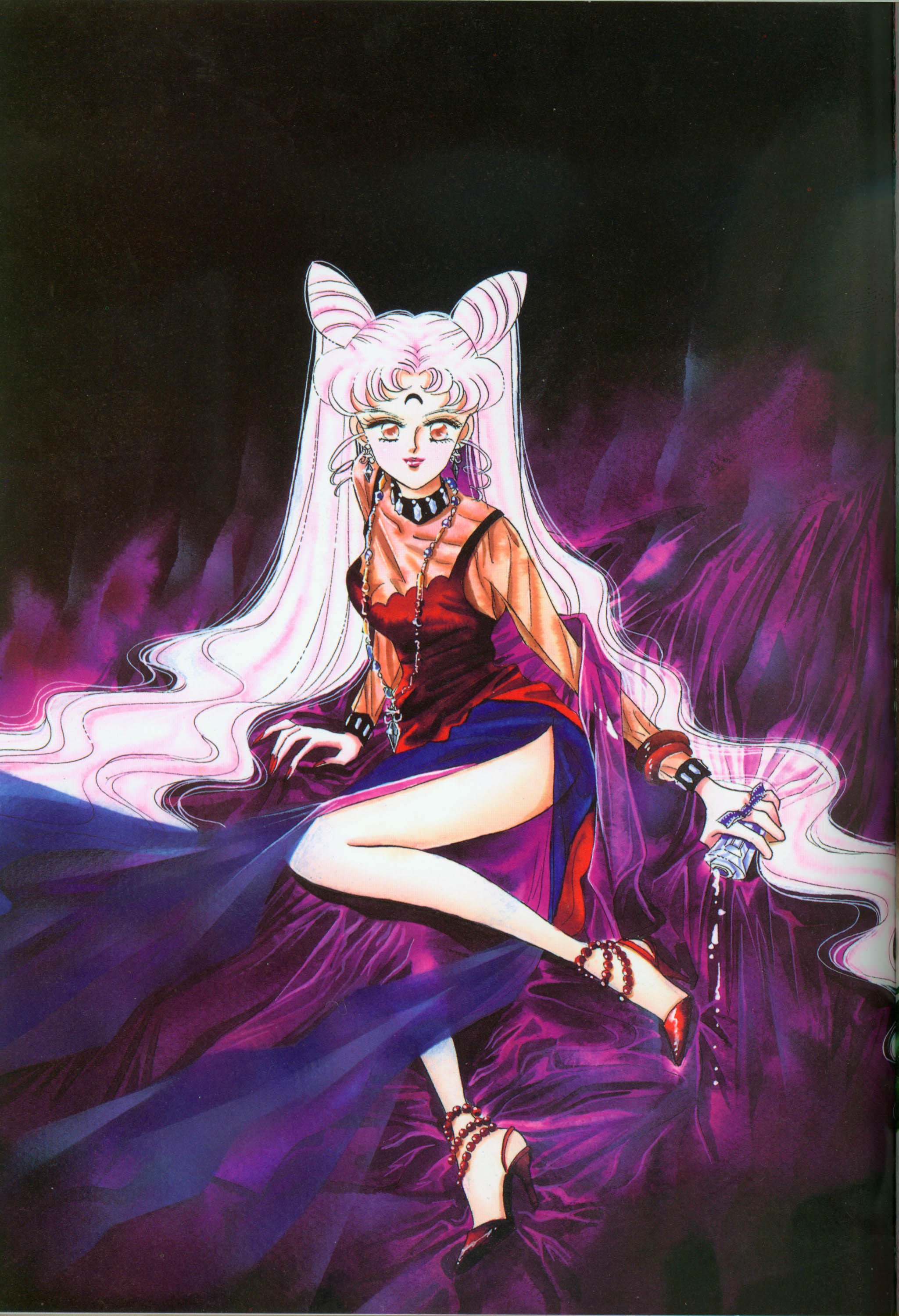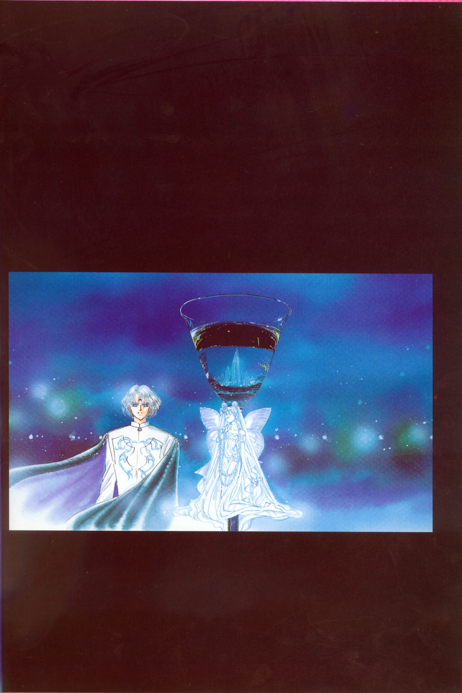 Сначала я хотела нарисовать этот рисунок для задней обложки пятого тома комиксов. Но у меня не было времени; в конце концов я завершила его для седьмого тома. Это меня радует. На этой картинке нарисован бокал. Ножка бокала в форме нео-королевы Селенити выполнена из молочного стекла.