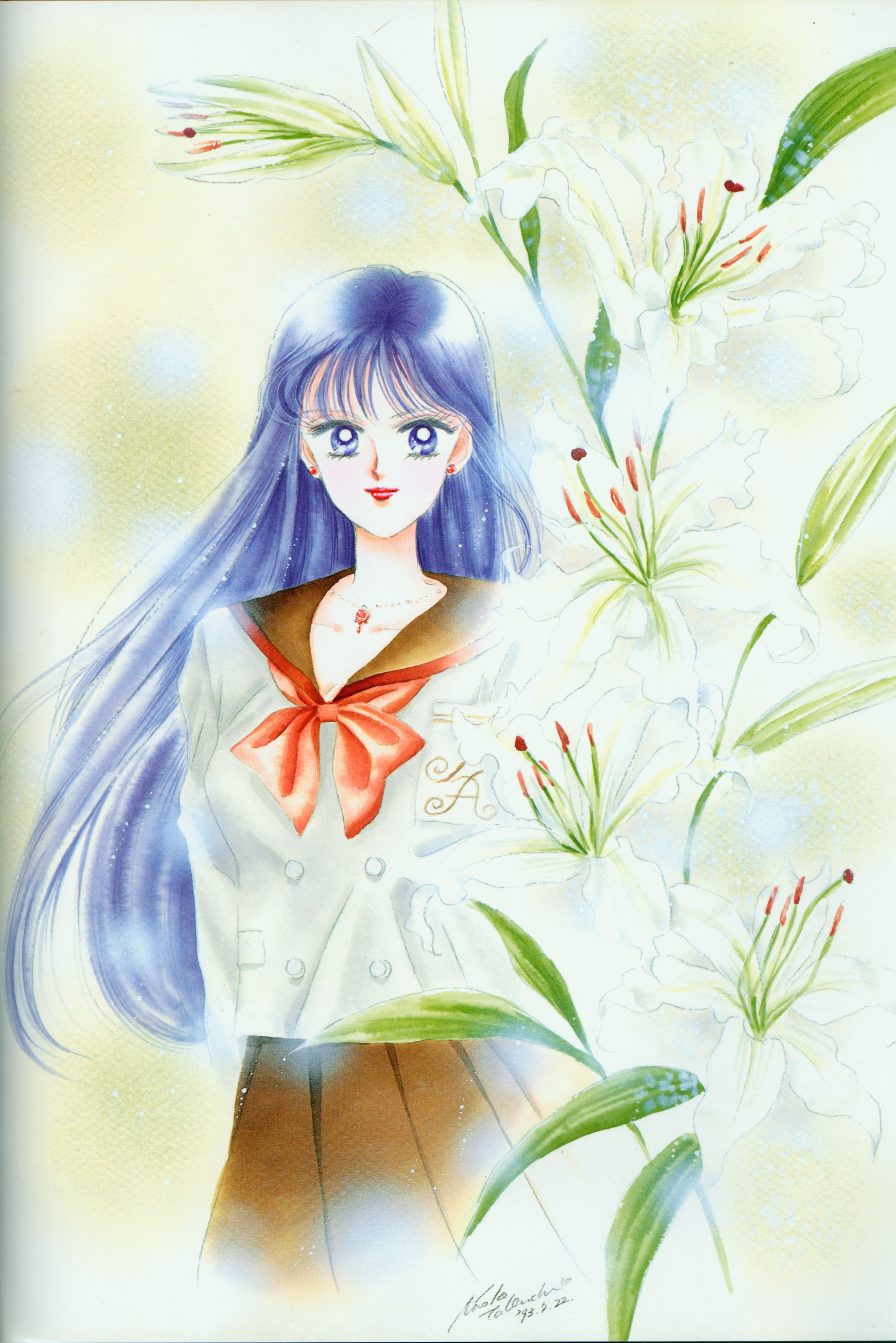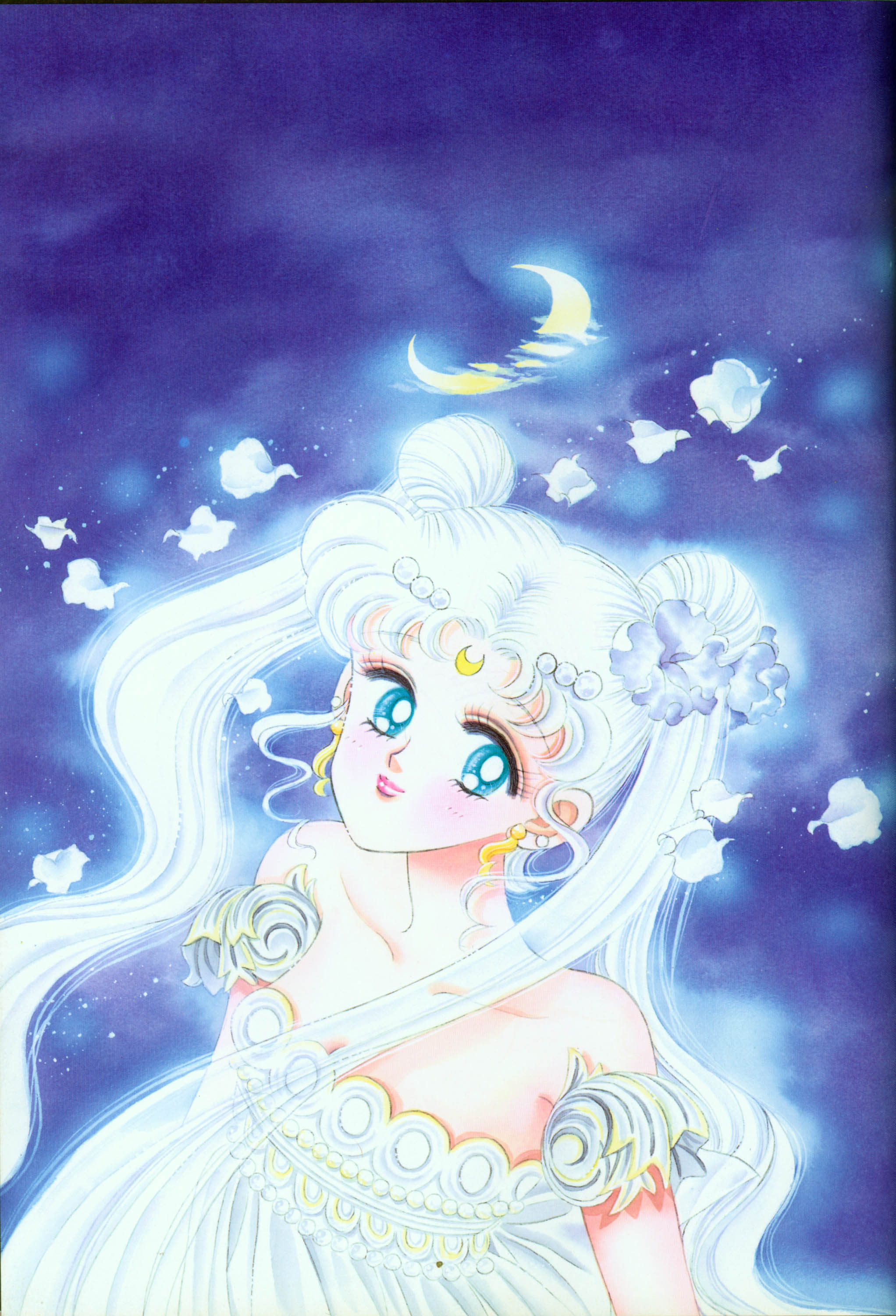 К тому времени, когда создавалась эта иллюстрация, я часто рисовала в комиксе цветы белой розы. У принцессы Серенити серебряные волосы. Фиолетовый, светло-голубой и белый действительно мои самые любимые цвета.