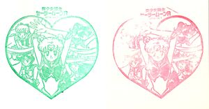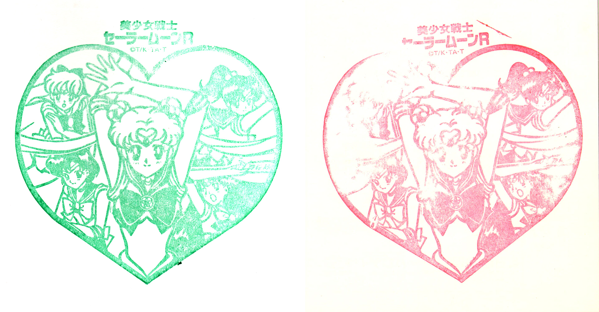 Кроме того в брошюрах присутствовали бонусы в виде наклеек (в буклетах, включавших "Sailor Moon S" и "SuperS"), развивающих игр и открыток. Помимо этого, каждый владелец брошюры в кинотеатре мог поставить памятную печать на специально отведенную страницу. Как показала практика, печати для одного фильма во всех кинотеатрах были почти одинаковыми, различаясь лишь цветом. Для сравнения приведу пример с печатью из памфлета "Sailor Moon R Movie". На картинке рядом зеленая печать из моего памфлета, розовая - из сканов с сайта aquantis.tripod.com.
