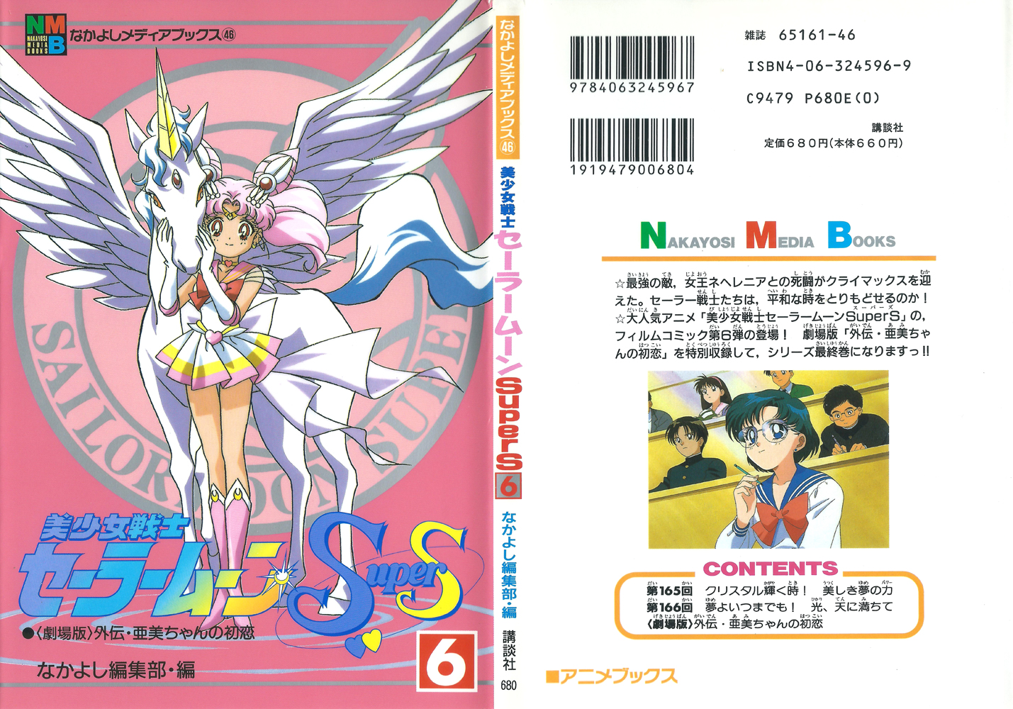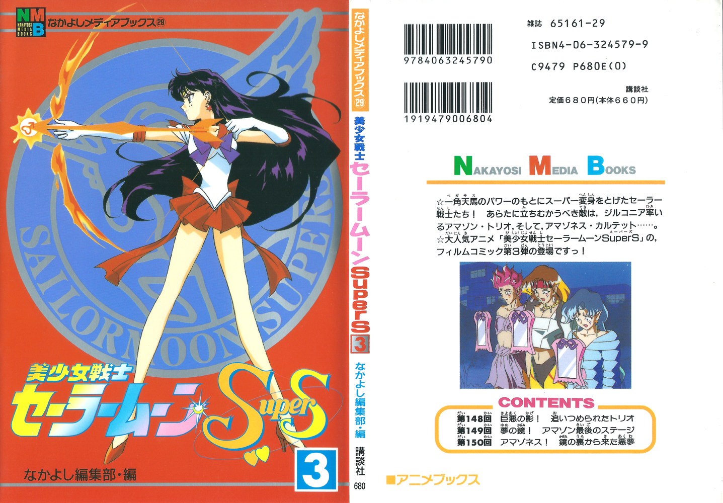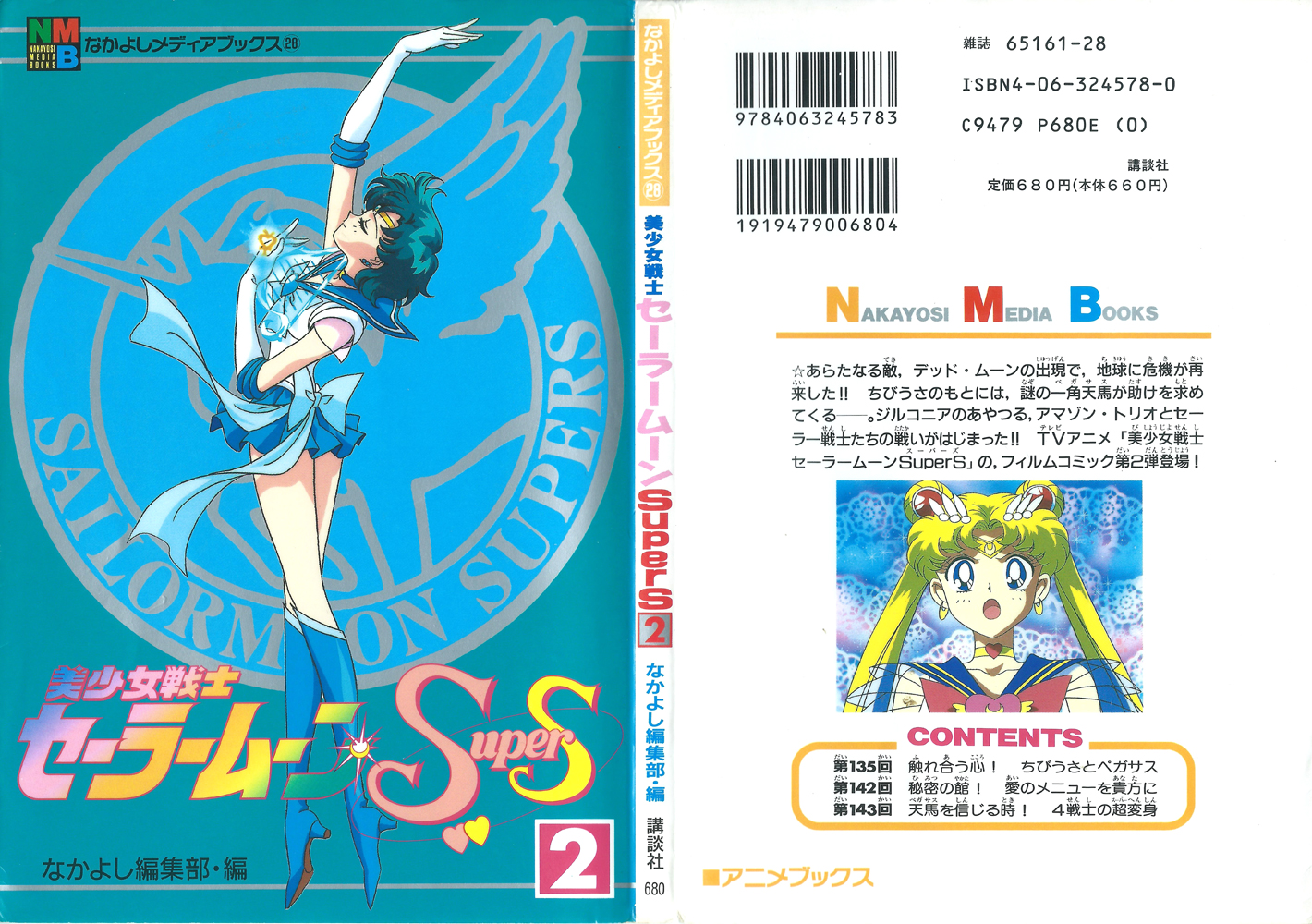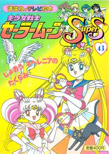 Сама обложка повторяет главное изображение суперобложки, но не в цветном, а в красно-белых тонах. Задняя обложка повторяет картинку задней стороны суперобложки, а также надпись Nakayoshi Media Books и Sailor moon Super (с краю еще есть надпись Anime Books), текста и содержания на обложке нет.