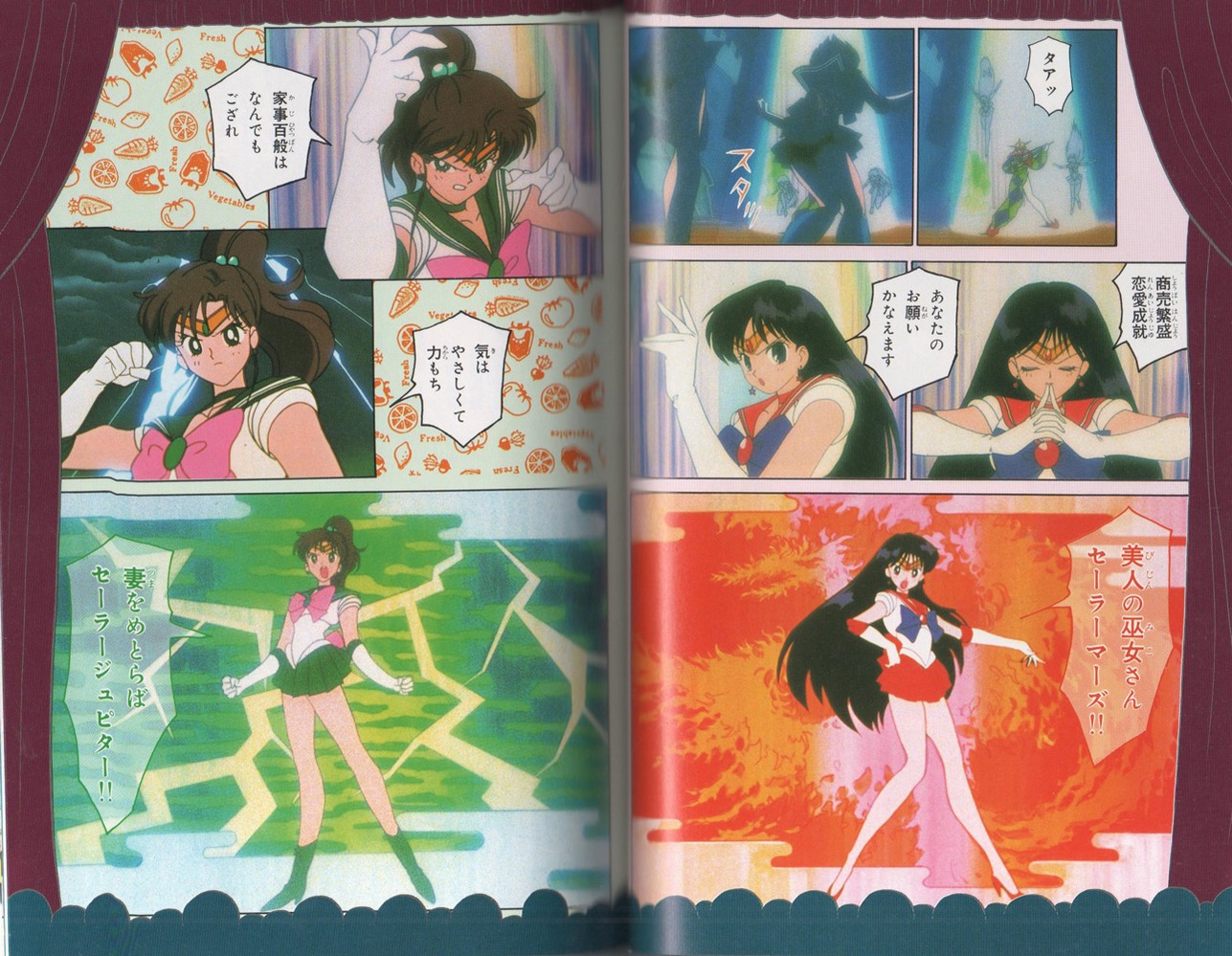 Сразу стоит отметить, что книги выполнены очень качественно, хотя и уступают книгам третьего сезона. За картинками порой присутствует фон: темный – там, где надо показать Сейлоров в логове врага, оранжевый (например) – там, где девочки наслаждаются теплой дружеской атмосферов…но чаще всего фон, конечно же, белый. В некоторых местах, чтобы пузыри текста не заслоняли всю картинку, ее докрашивают однотонным цветом, тем самым увеличивая. Текст достаточно простой. Но не стоит надеяться, что в книге вы встретите диалоги из аниме. В четвертой части комиксов нужно готовиться к тому, что они местами были видоизменены (местами для того, чтобы объяснить происходящее через мангу, как было с Золотым Кристаллом). Однако сама сюжетная канва осталась прежней, что отличает данную серию книг от тех же «Книг с картинками от Коданся», где сюжет порой не соответствует аниме (а уж манге – тем более).