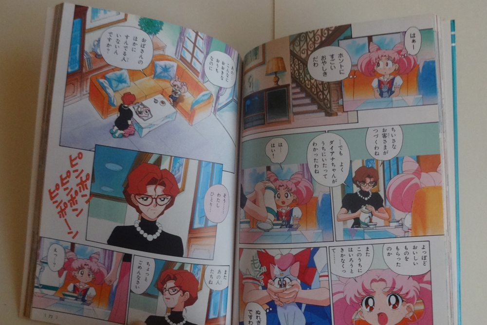 Как уже отмечалось, тексты в книге представляют собой краткий пересказ. Их немного и надписи довольно-таки крупные. Кроме того, раз книги предназначались для первоклассников, то они содержат крайне мало иероглифов. Если не считать обложки, которые содержали служебную информацию об издании, то во всей книге SMR 21 (единственный Э Хон, которым обладали на момент написания этой статьи модераторы Sailor Galaxy) содержит всего два иероглифа! И те обозначают числа «четыре» и «пять» (иероглифы, использующиеся для обозначения чисел, являются первыми, которые учат японские дети в школах). Все остальное – сплошная кана. Но и это еще не все! Как вы знаете, в японском языке используются два вида азбуки (каны) – это хирагана, которой записывают исконно японские слова и катакана, предназначенная для записи иностранных слов. «Сейлор Мун» содержит очень много иностранных слов – это и имена Сейлоров, и названия камней, от которых произошли имена собственные злодеев и названия различных предметов/мест. Но маленькие японцы начинают изучение азбук с хираганы, поэтому для тех, кто еще не успел выучить катакану, все иностранные записи прописаны фуриганой (хираганой мелкого шрифта).