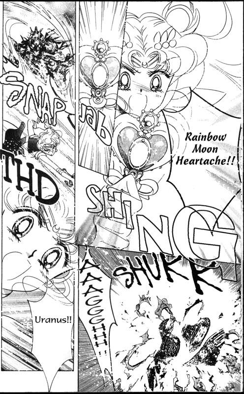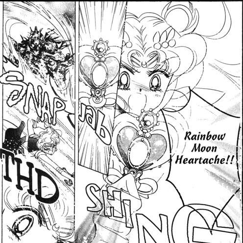 Вариация этой атаки Rainbow Double Moon Heart Ache (Двойное радужное страдание Луны, レインボー・ダブル・ムーン・ハート・エイク/虹色双月心激) использовалась в 29 акте против Владычицы 9. Супер Сейлор Мун исполнила ее при поддержке Супер Сейлор Чиби Мун (именно поэтому и "двойное страдание"). Вдвоем Сейлоры даже смогли ранить сильного противника.