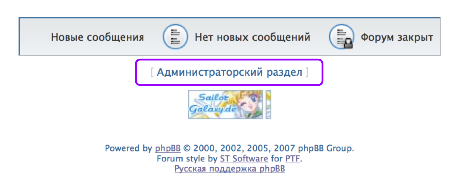 Зайди в администраторский раздел на форуме, кликнув на ссылку “Администраторский раздел” внизу любой страницы форума: