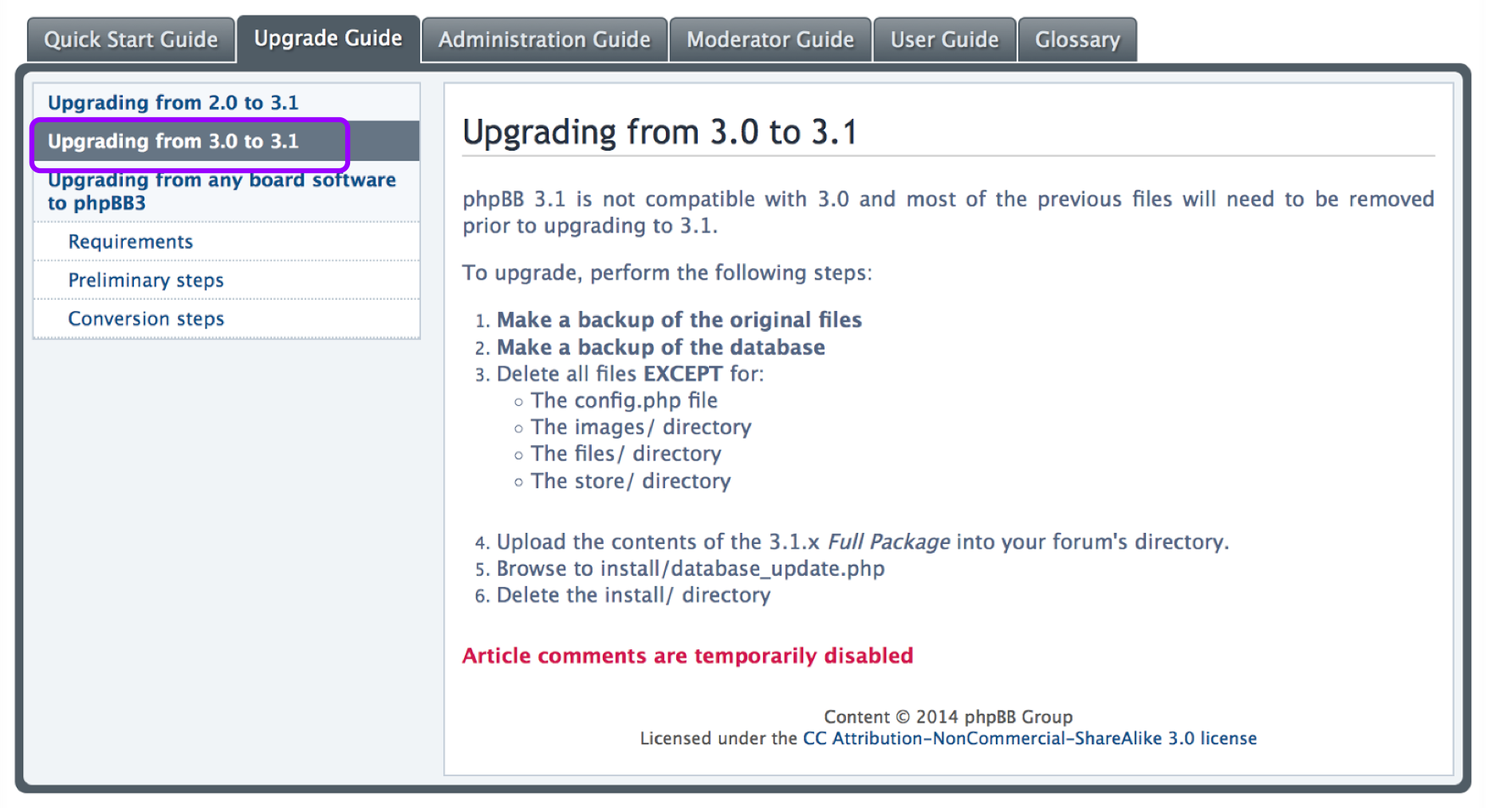 В нашем примере, да, на этом сайте слева есть ссылка на документацию о том, как обновить форум с версии 3.0 на версию 3.1. Кликни на ссылку, которая соответствует твоим версиям, в нашем примере это "Upgrading from 3.0 to 3.1"