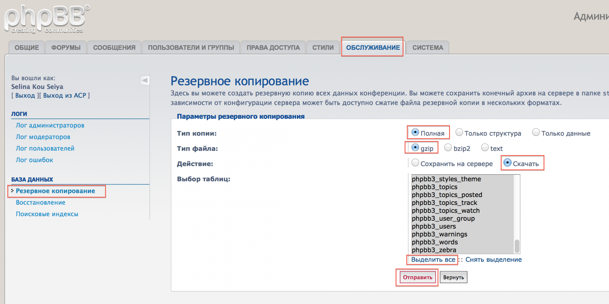 Кликни на "Облуживание" в верхней навигации, кликни на "Резервное копирование" в навигации слева. Проверь, чтобы усновки "Полная" и "gzip" были выбраны. Выбери установку "скачать". Кликни на "Выделить все", чтобы автоматически выделились все таблицы. Кликни на кнопку "Отправить".