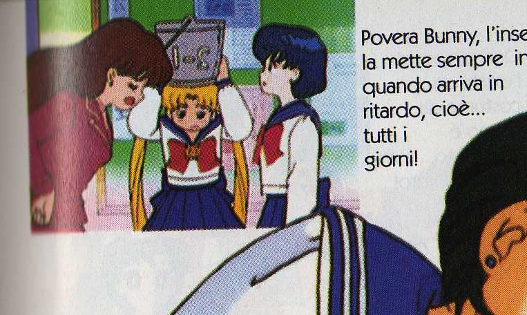 Конечно, как и во всех отзеркаленных книгах не обошлось без казусов: так, например, на картинке рядом вы можете видеть Усаги, которая держит на голове ведро с надписью 2-1, однако цифры в итальянской версии перевернуты.