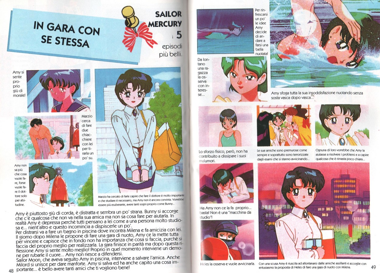Насколько точный и полный перевод сделали итальянцы, я сказать не берусь по причине незнания итальянского языка, однако отсутствующие местами тексты наводят на мысль, что в любом случае перевод был неполным даже в тех разделах, которые были включены в итальянскую книгу. Так, например, чуть выше вы видели изображение из итальянского фан бука Сейлор Меркурий (раздел с перевоплощением этой Воительницы). Рядом я поместила скан японской книги. Как видите, у итальянцев отсутствуют все заголовки (выделены у японцев цветным шрифтом), а также подпись рядом с Сейлор Меркурий, получившей силы от Пегаса (видимо, она не уместилась). Кроме того, у итальянцев в шапке наверху комментарий слишком короткий по сравнению с японской версией, так что вполне очевидно, что из перевода что-то выкинуто, либо итальянская надпись и вовсе взята с потолка. Точно так же, кстати, итальянцы и вовсе избавились от аналогичных комментариев в почти каждой серии из раздела «Top-5 лучших эпизодов» (комментарии оставлены лишь у одной серии).