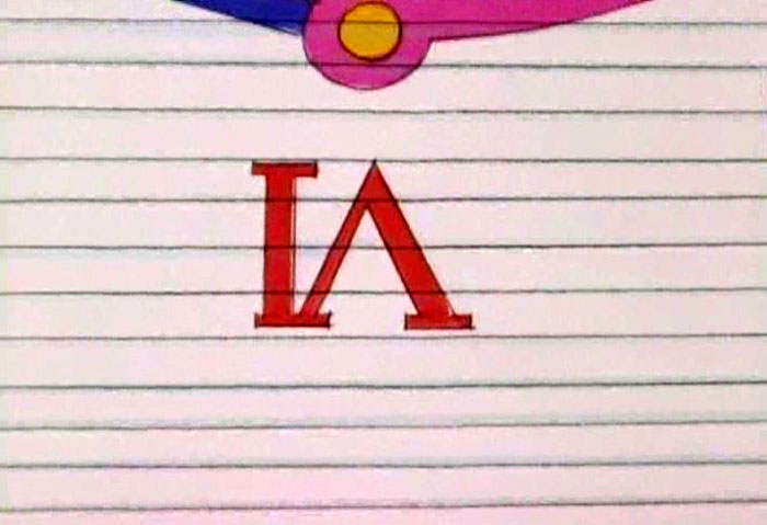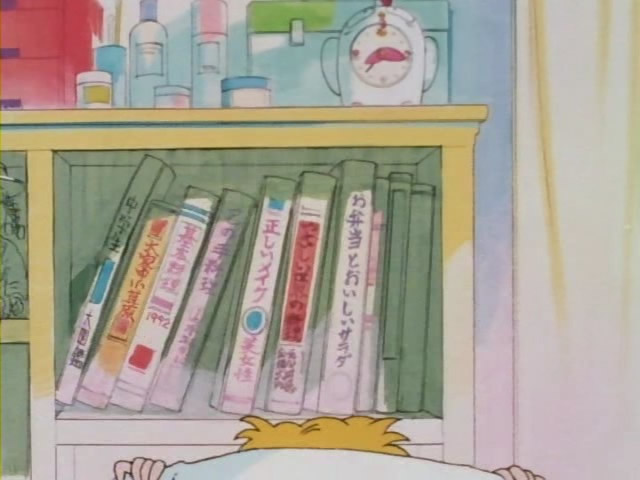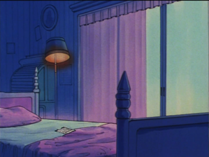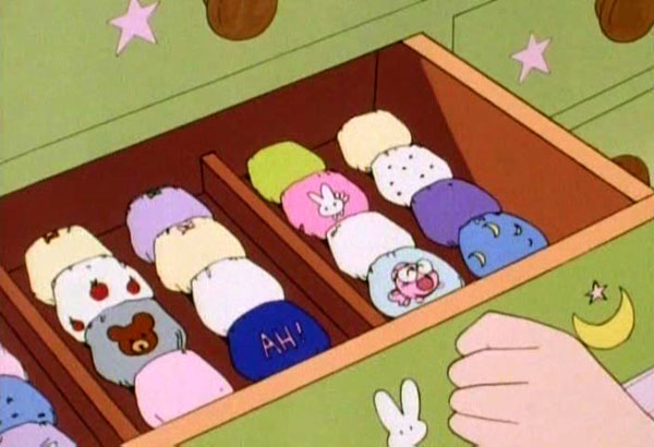 В этой сцене снова фигурирует розовый. Кстати, вы заметили, в каком идеальном порядке обычно не слишком аккуратная Усаги содержит свое белье? Наверное Икуко стоило большого труда добиться этого от дочери. На шкафчике Усаги кролики, звезды и полумесяцы. На ее трусиках - кролик, уже известная нам рыбка и надпись "AH!"