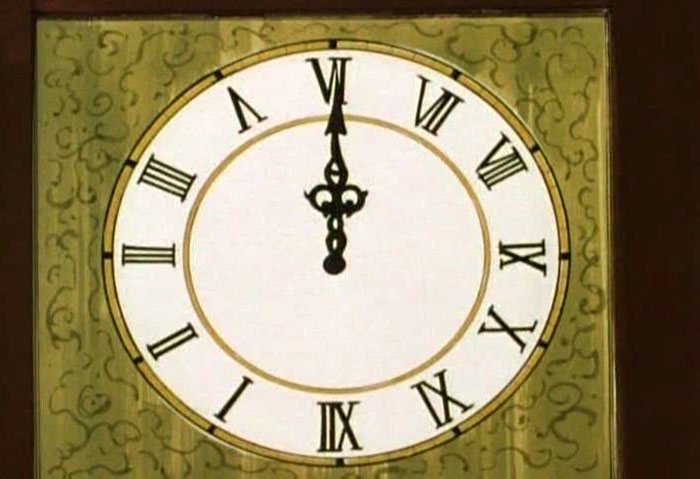 То же происходит и с цифрами на часах в самом магазине. Цифры перевернуты, написаны не на своем месте (6 и 12). Римская IV записана более не используемым, "устаревшим" способом - "IIII". Видимо это сделано для того, чтобы зритель сразу понял - часы-то с подвохом.