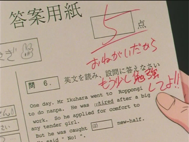 Отрывок из неудачного для Усаги теста по английскому: "One day, Mr. Ikuhara went to Roppongi to do nanpa. He was (1) tired after a big work. So he applied for comfort to any tender girl. But he was caught (2) _____ new-half. He said " No! ""