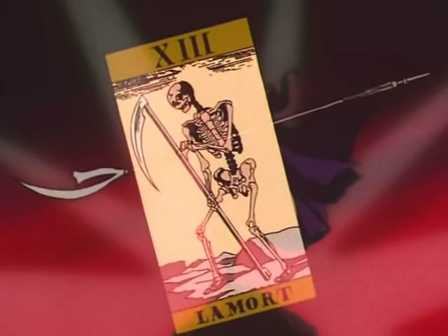 На карте таро, символизирующей воина Разрушения, изображен скелет с Косой Безмолвия. На верхе карты цифра XIII, символизирующая, по мнению каббалистов смерть и несчастье, внизу – слово "La mort", что в переводе с латинского означает "смерть".