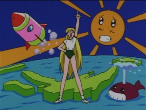 Минако в 174 серии изображена на фоне всякой-всячины и карты Японии.