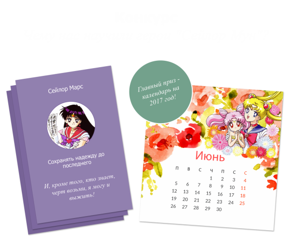 Sailor Galaxy проводит конкурс "Чему нас научили герои "Сейлор Мун". Расскажи, чему тебя научили герои и получи шанс выиграть главный приз - настенный календарь на 2017 год! Участвовать в конкурсе очень просто, поучаствовать может действительно каждый. По предоставленному шаблону создай картинку с персонажем и добавь его цитату, которая тебя вдохновляет или однажды повлияла на твое мировоззрение. Читай подробные условия конкурса на форуме, принимай участие на форуме или в нашей группе ВК.