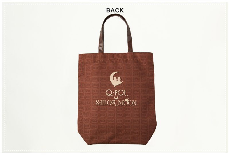 - Сумка с официальным артом сотрудничества, изображающим всех десятерых воительниц в платьях. Общий фон сумки - коричневый узор в виде плиток шоколада. Сзади - надпись "Q-pot. Sailor Moon", с узорами в виде силуэтов Луны, Артемиса и Дианы, сидящих на полумесяце и самого полумесяца. Формат - А4, есть также внутренний карман. Цена - 3800 йен.