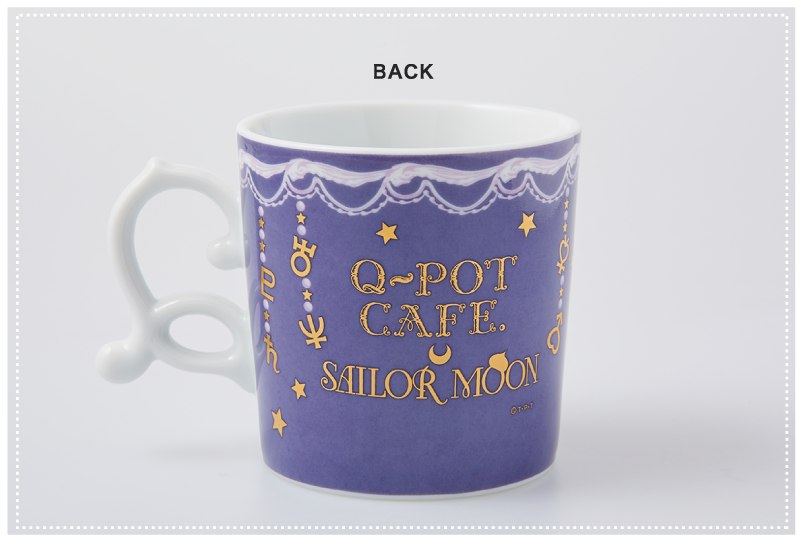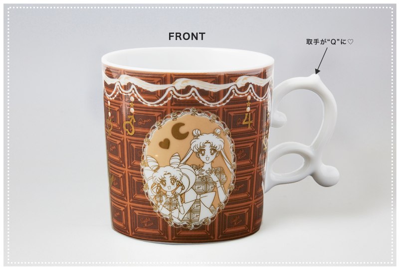 - Кружка с изображением Усаги и Чибиусы в узорчатой рамке. По верхнему краю кружки - узор в форме лент, цепочек и подвесок с символами планет. Фон, как и в случае с сумкой - коричневый в виде шоколада. На задней части кружки, как и в предыдущем случае - надпись "Q-pot. Sailor Moon" с узором в форме полумесяца. Ручка кружки выполнена в форме большой витиеватой буквы "Q". Цена - 2800 йен.