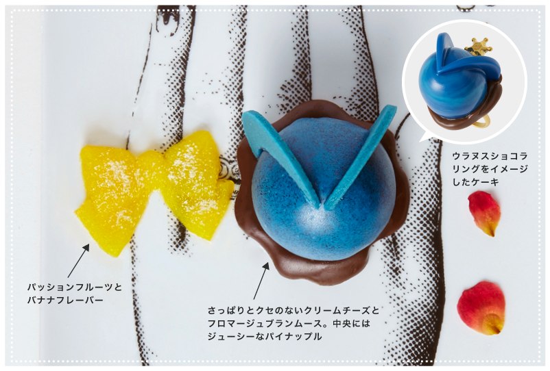 - Пралине "Сейлор Уран": пирожное-пралине в форме навершия жезла для трансформации Сейлор Уран и мусс жёлтого цвета, в форме банта Уран, посыпанный сахарный пудрой. Подаваться будет на тарелке с узором в форме руки, на которой пирожные будут располагаться как кольца. В качестве дополнения, запястье руки будет украшено "браслетом" из шоколадной конфеты в форме розы и шариков-"жемчужин" из взбитых сливок. Также блюдо будет посыпано лепестками роз. Цена - 2200 йен.