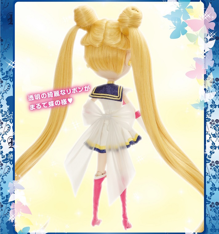 Линейка Pullip-кукол по СМ продолжает пополняться и очередным "обновлением", на этот раз, стала Сейлор Мун в своей супер форме из 3 сезона. Кукла сделана с большим вниманием к деталям: роскошные волосы, заплетённые в оданго, миниатюрная брошь Космического Сердца, диадема с полумесяцем, задний бант из ткани и т.д. Как и все предыдущие куклы, эта имеет шарниры, благодаря которым она может двигаться и принимать различные позы, а её глаза могут двигаться из стороны в сторону и моргать. Высота куклы - 31 см. Как и в случае с предыдущими куклами, Супер Сейлор Мун выйдет в комплекте с подставкой и картой профиля.