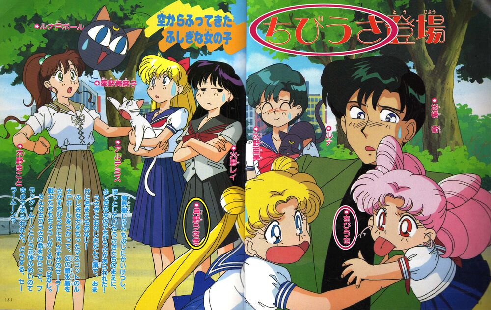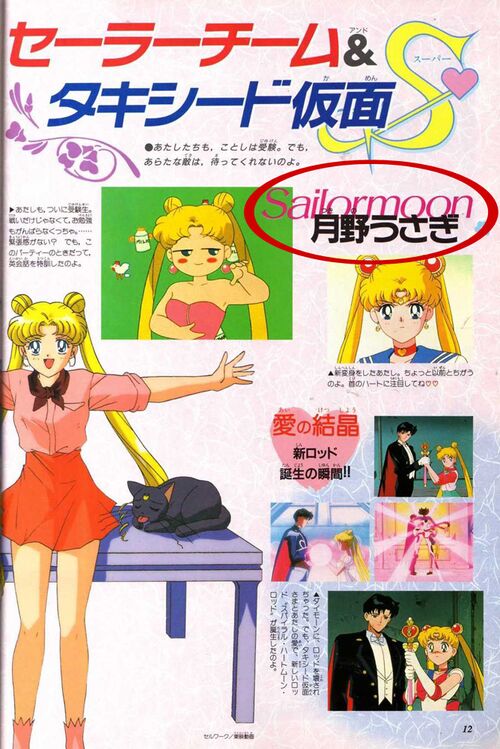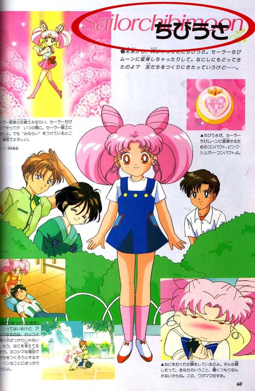 Страница, посвященная Чиби Усе, есть и в книге TV Magazine Deluxe Sailor Moon RI. На ней изображены все главные герои второго сезона. Имя Чиби Усы я отобвела розовым, а имя Цукино Усаги – желтым: