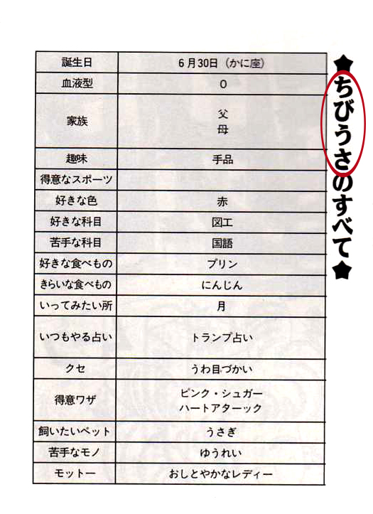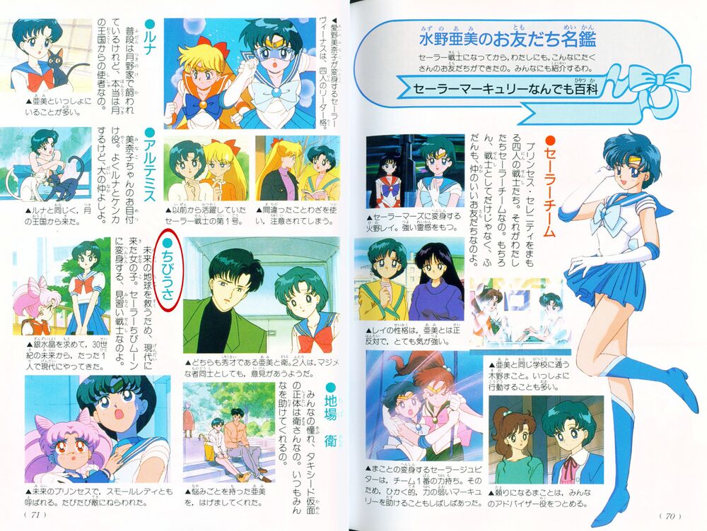 Посмотрим еще одну книжку. На этот раз это скан из официального фан бука Мизуно Ами. Там есть момент, где Ами рассказывает нам про своих друзей. Среди них есть и Чиби Уса. Вот как выглядит страничка: