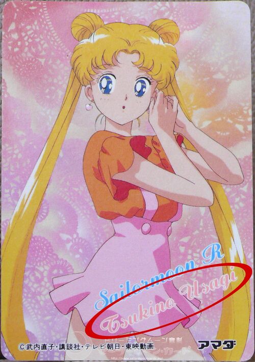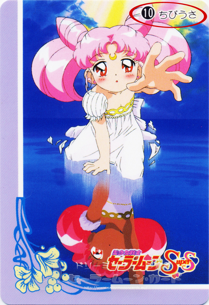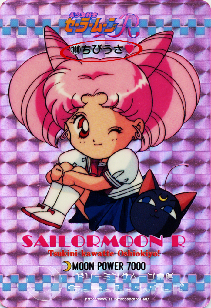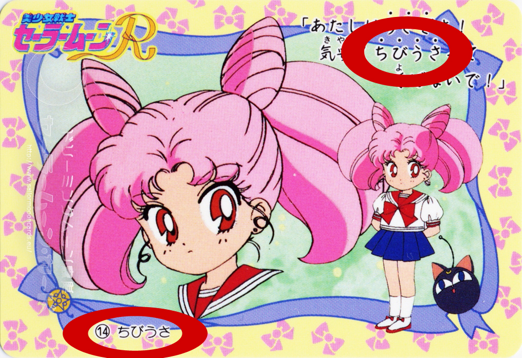 На примере других карточек вы также можете убедиться, что с нашей розововолосой героиней встречается только одна надпись «Чиби Уса» [ ちびうさ ], а не какое-нибудь выдуманное «Чиби Усаги Цукино», которое выглядело бы по-японски так: 月野ちびうさぎ.