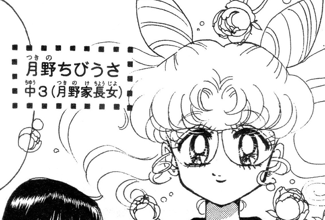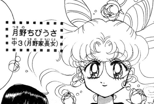 которое переводится: «Цукино Чиби Уса, третий класс средней школы, старшая дочь семьи Цукино». Вот единственное место в манге, где девочка именуется такими фамилией и именем, как Чиби Уса Цукино. Но согласитесь, что исходя из сюжета и конструкции мира, в этой манге девочка имеет полное право на данную фамилию ^.~ (Кстати, тогда получается, что муж Усаги из «Параллельной Луны» либо взял фамилию жены, либо остался на своей. Знаю, что первый вариант в Японии вполне применяется, а что со вторым на сегодняшний день, мне ничего не известно. Раньше нельзя было).
