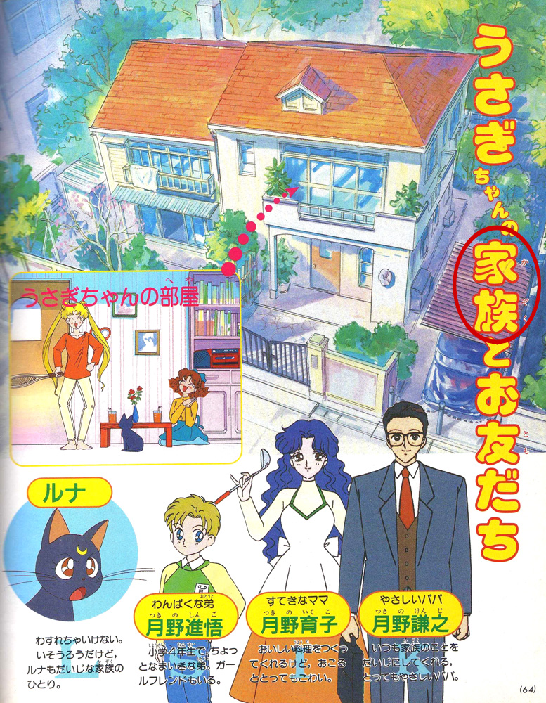 Тут вы можете видеть всех членов семьи Цукино из первого сезона. Как мы видим, они все указаны с фамилией: Цукино Кэндзи 月野謙之 , Цукино Икуко 月野育子 , Цукино Синго 月野進悟 (уж простите за систему Поливанова, но я люблю писать по правилам^^”). Т.е. по идее, если все члены семьи Цукино указываются с фамилией, то и Чиби Уса должна бы указываться, ан нет.