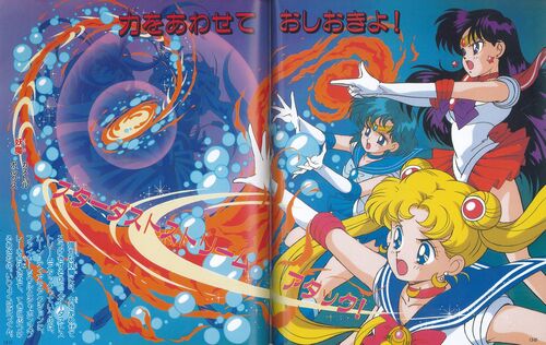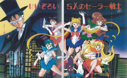 Помимо этого используются изображения из сериала непосредственно. Здесь по эдитингу тоже нареканий нет, чего не сказать о подборе материала. Так, например, на обложке второй книги (напомню, она посвящена первому сезону) красуются Ситэнно, четыре Воина-Хранителя и Сейлор Мун в костюме из третьего(!) сезона.