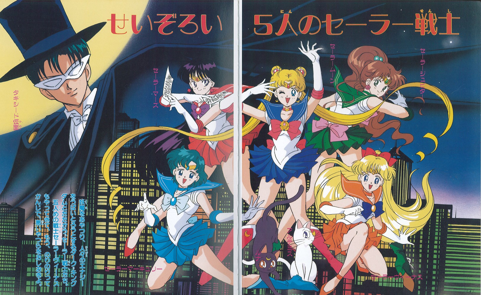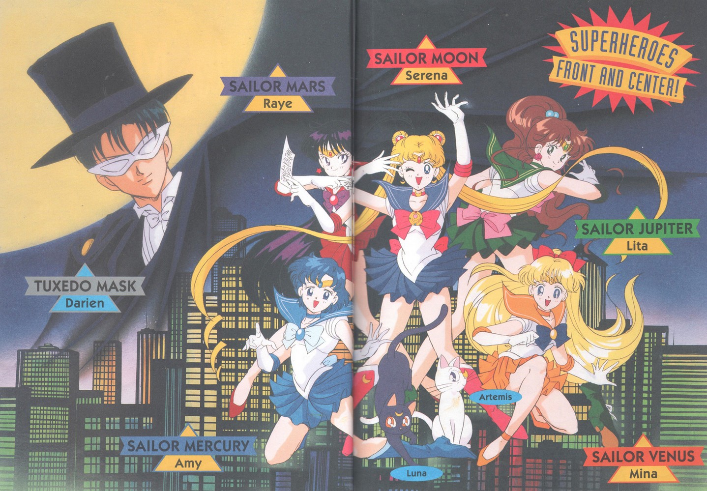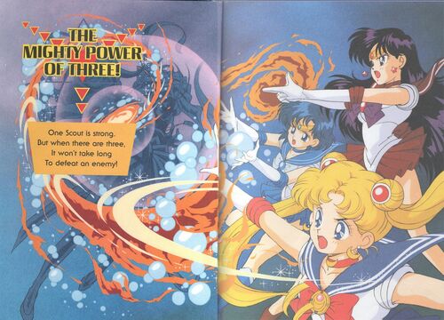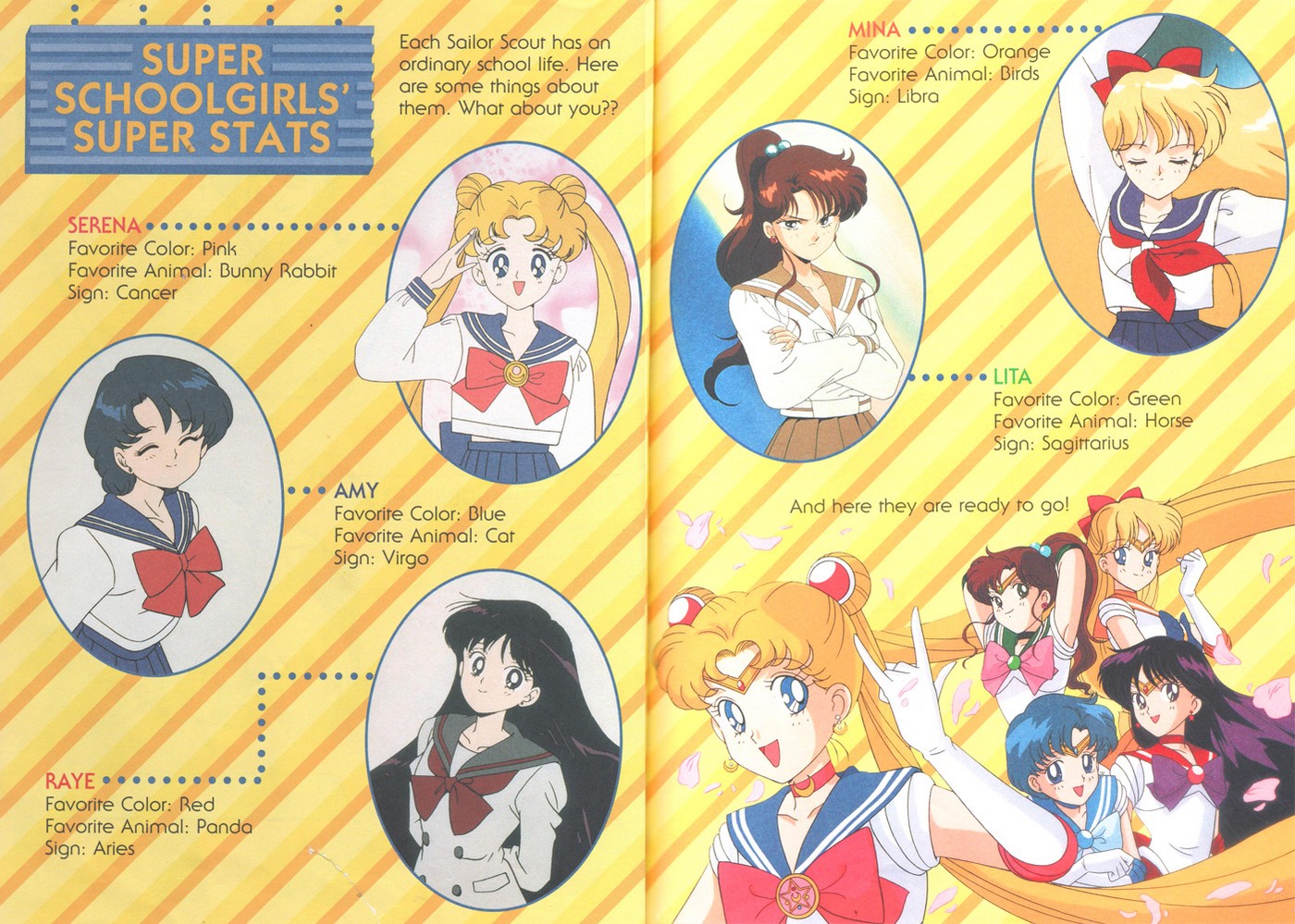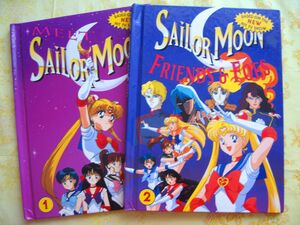 Две эти книги посвящены первому сезону. Однако вошло немного, т.к. в каждой книге всего по 16 страниц. Первая книга («Meet Sailor Moon») почти всецело посвящена Сейлор Воительницам. По развороту отведено на Сейлор Мун, Сейлор Меркурий и Сейлор Марс; еще по странице – на Сейлор Юпитер и Венеру. По развороту также на специальные возможности и приспособления воительниц и на их повседневную жизнь. В конце книги по странице отведено на Таксидо Камэна и на все Темное королевство. Учитывая, что огромное пространство в книге занимают изображения, на текст остается не так много места.