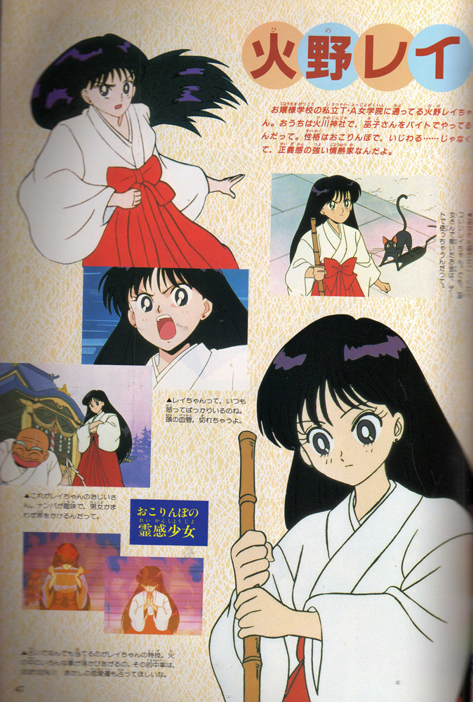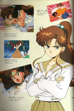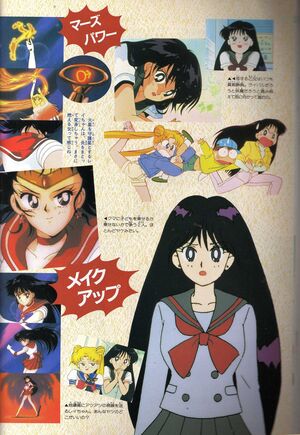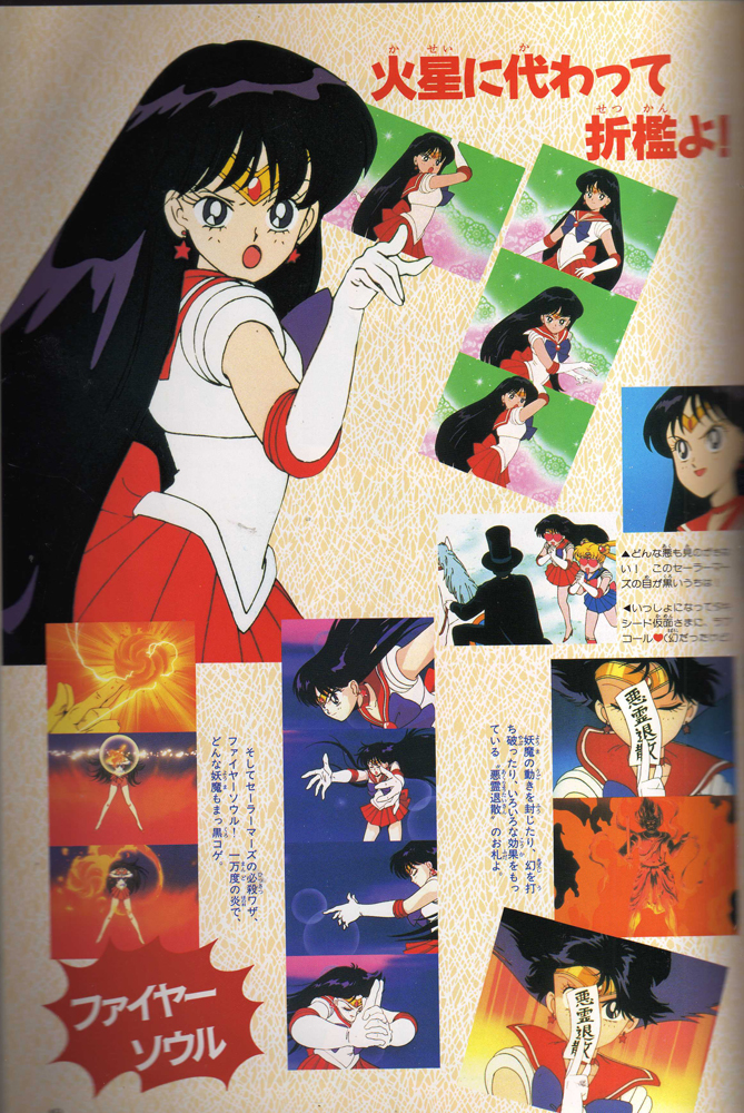 С 42 страницы снова начинается перечень эпизодов, и на 47-ой нас уже ждет раздел, посвященный Хино Рэй. Первая и половина второй страницы посвящены непосредственно Рэй. Тут нам показывают, как она обращается к огню, какие у неё отношения с дедушкой, с Усаги. На 48 странице снова можем наблюдать перевоплощение Рэй в Сейлор Марс (все это в скриншотах), а на 49 странице собраны скрины речи Сейлор Марс, атаки «Душа огня» и «Акурёу Тайсан». Далее, со страницы 50 снова идут описания серий. И так до 83 страницы. Последняя серия, которая попала в этот аниме альбом – это серия 24, повествующая о гибели Нефрита. Она занимает целых 4 страницы.