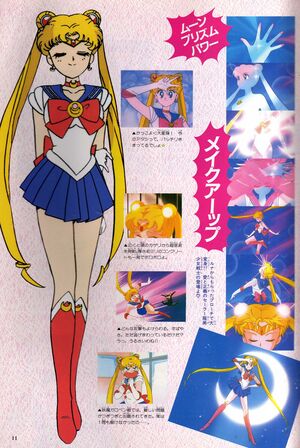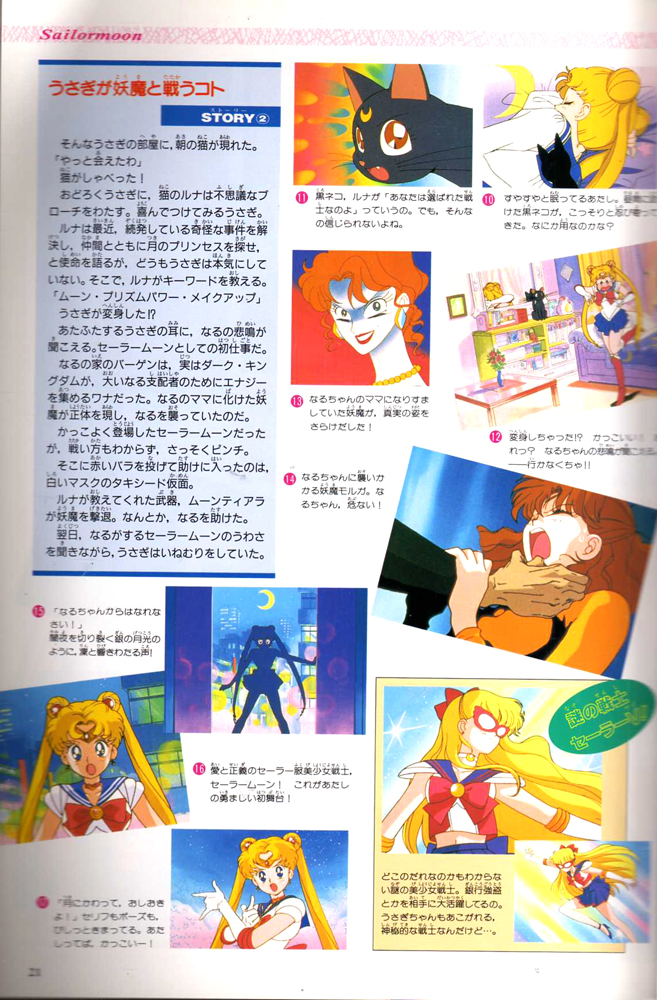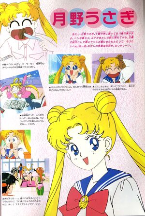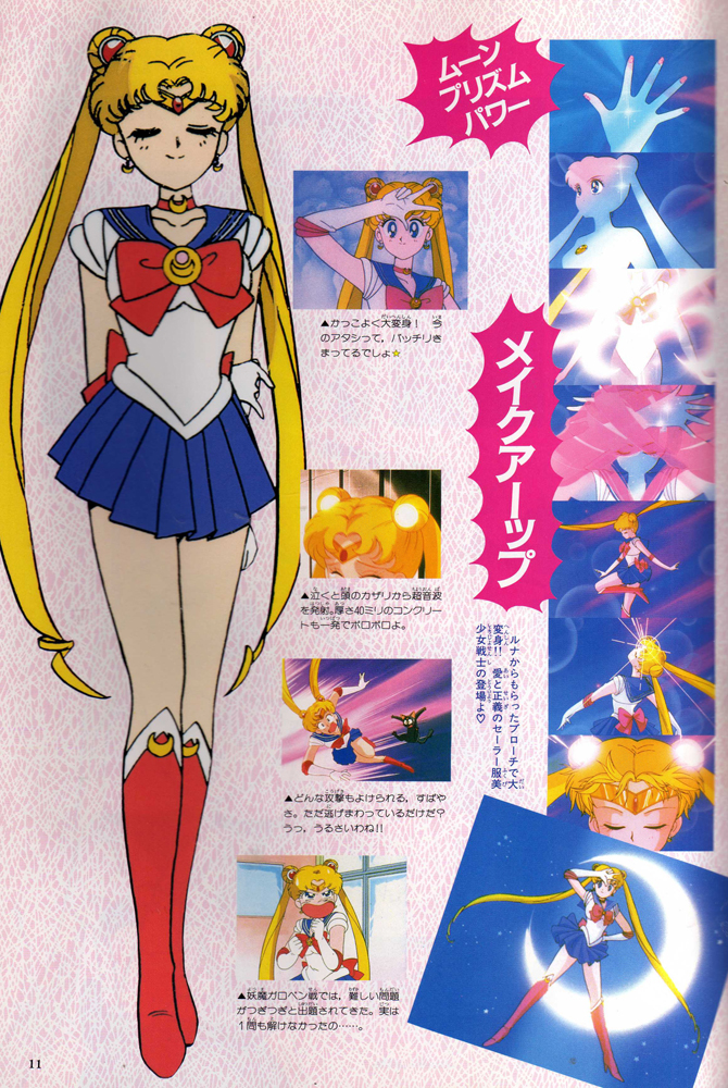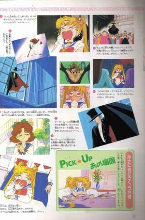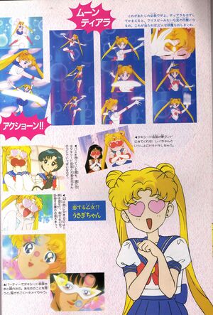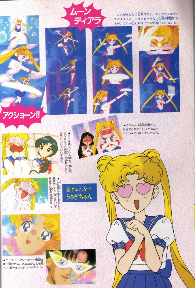 Разворот 10-11 посвящен всецело Усаги / Сейлор Мун. На страничке 10 изображена Усаги с разных сторон: мы можем видеть, что она любит поесть, какая она мечтательная, как делает домашнее задание (притом, что на столе у неё лежит манга). На 11 странице в розовых облаках написана фраза «Мун пуризуму пава: Мэйку а:ппу», и вот перед нами уже Сейлор Мун. Рядом даны скриншоты её первого перевоплощения, а также первое сражение. 12-ая страница так же посвящена Сейлор Мун. А точнее её атаке «Му:н тиара аксён», если читать по-японски надписи из облаков. Рядом даются скриншоты этой самой атаки. Нижняя часть страницы посвящена тому, какая же влюбчивая девушка Усаги. Рубрика так и называется «Коисуру отомэ?! Усаги-тян». В основном там собраны картинки с Усаги, у которой глаза сердечками. Но не забыли поместить изображение и предмета её воздыханий, Таксидо Камэна.