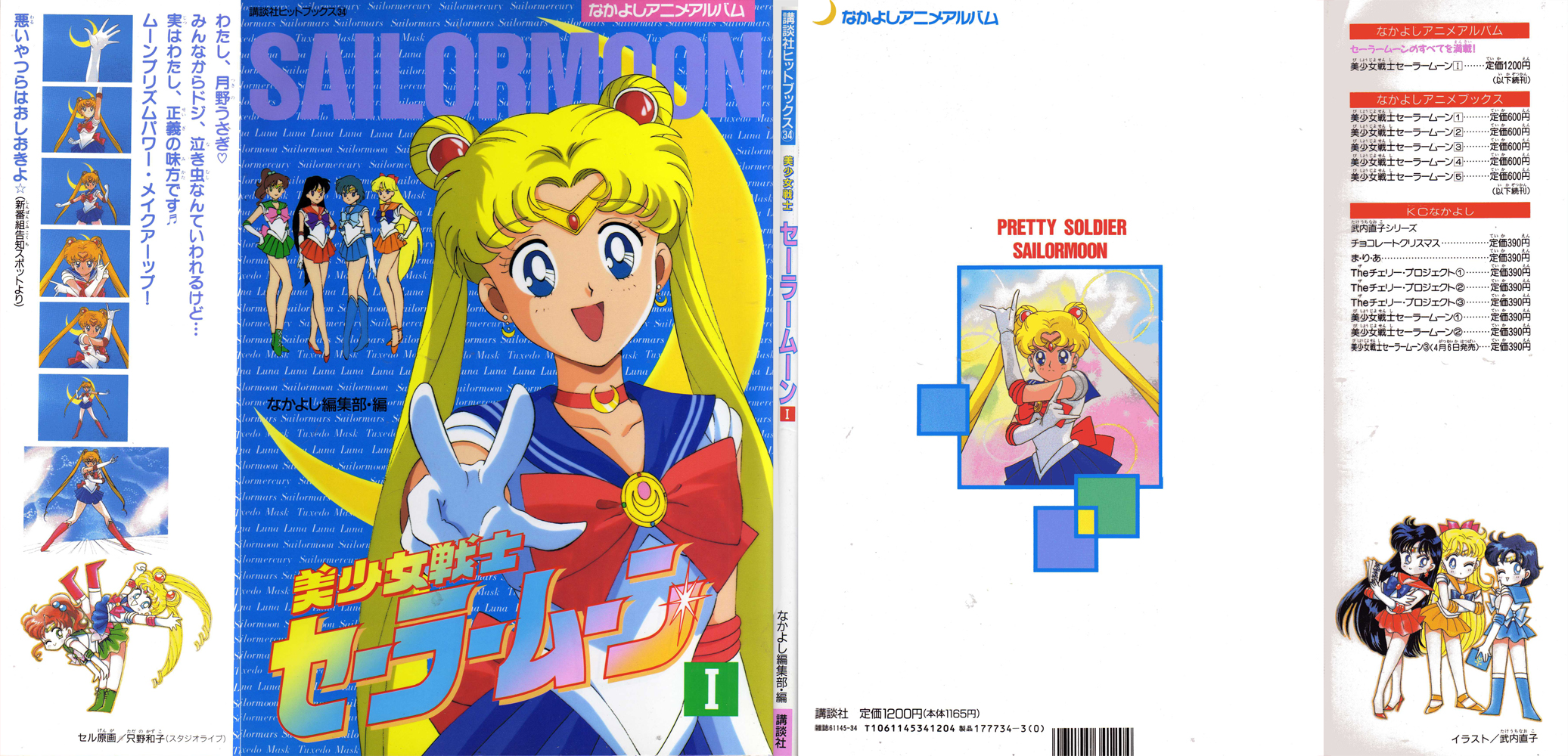 Самый первый аниме альбом, вышедший по первой половине первого сезона сериала «Сейлор Мун», имеет размеры 26см*30см. Его съемная обложка синего цвета в полосочку. Каждая полоска содержит имя одного персонажа: Сейлор Мун, Сейлор Меркурий, Сейлор Марс, Таксидо Камэна или Луны. На переднем плане изображена Сейлор Мун и надпись на японском «Бисёдзё Сенси Сэ:ра: Му:н I». Сзади Воительницы изображен полумесяц и надпись на английском «Sailormoon». На заднем плане красуются четыре Воина-Хранителя, которые, в общем-то, изображены довольно схематично. В верхнем правом углу находится розовый прямоугольник, в который заключена надпись «Накаёси Аниме Альбом».