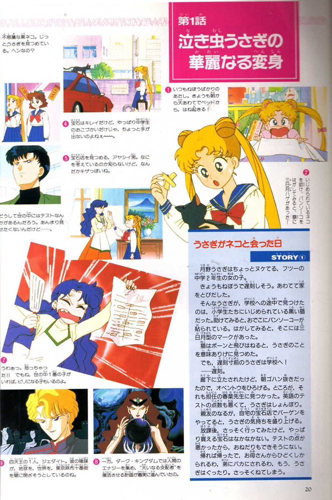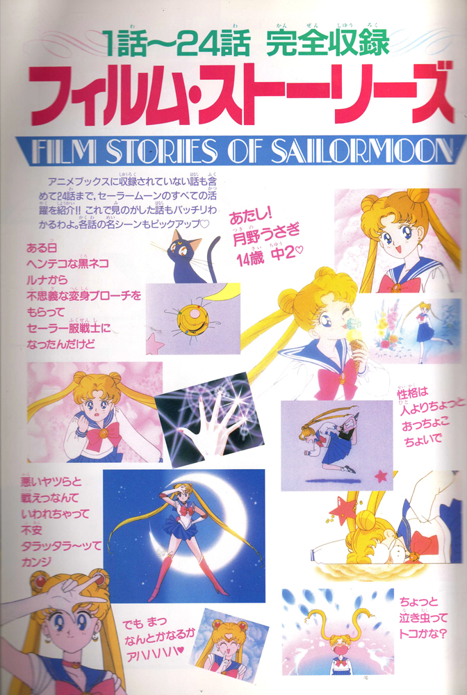 С 19 страницы начинается раздел «Film Stories», который включает в себя описание серий в картинках с 1 по 24-ую. Начинается все это с традиционного представления Усаги в начале серии (тоже дано в картинках). Описание каждой серии занимает по две-три страницы. Описание одной серии содержит номер и название, заключенные в цветной однотонный квадрат вверху страницы; один или два блока под названием «STORY», в котором кратко пересказывается основная сюжетная линия эпизода, множество картинок из серии, которые сопровождает текст, а также рубрику Pick Up Anobamen, в которой содержится обычно то, на что следует обратить в этой серии внимание. Так, в 9 серии особое внимание уделяется моменту, в котором Усаги под влиянием временного коридора то молодеет, то старится (хотя последнее было только в её воображении, но картинка все равно приведена).