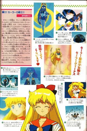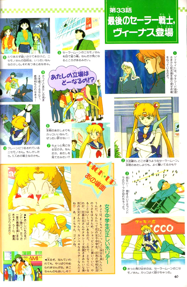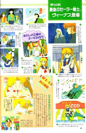 33 серия известна тем, что в ней впервые появляется Сейлор Венера. Поэтому после неё следует раздел, посвященный этой Воительнице. Лист, посвященный Сейлор Венере, построен таким же образом, как и разделы, посвященные другим Воительницам из первого аниме альбома. Картинки на страницах показывают нам разные стороны Минако как человека, её перевоплощение и атаку.