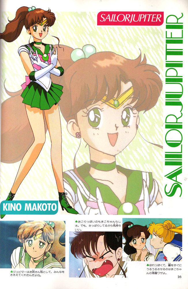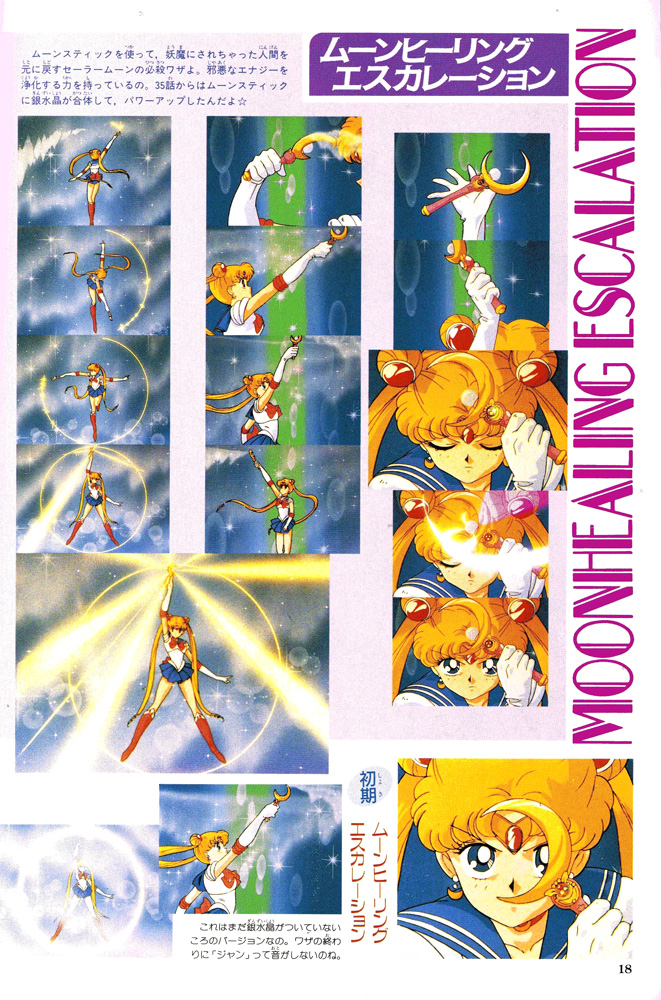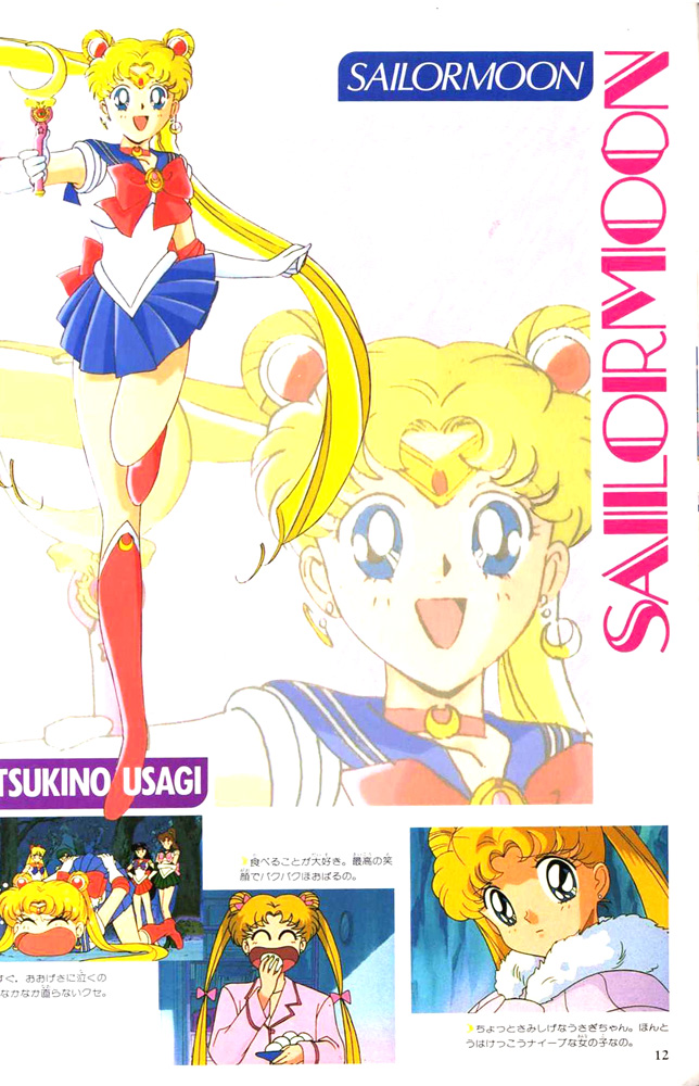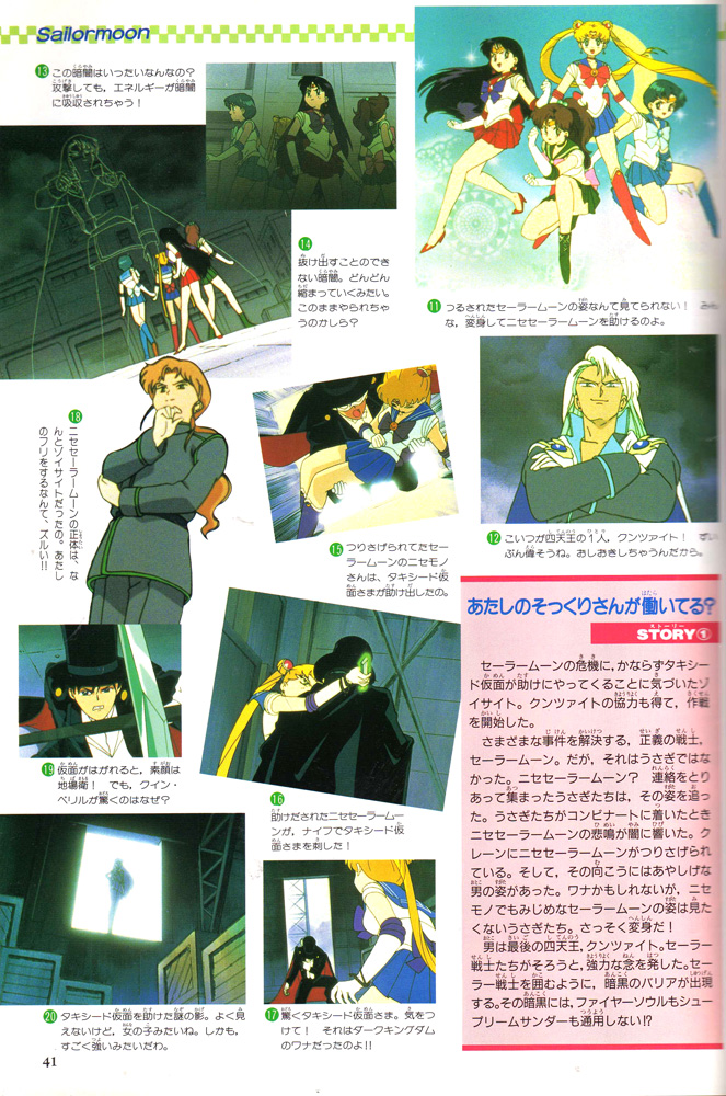 Следующие 7 страниц посвящены основным персонажам этой сюжетной арки. Так, страница 11 посвящена Луне и Артемису, 12 – Сейлор Мун, 13 – Таксидо Камэну, 14 и 15 – Сейлор Меркурий и Сейлор Марс соответственно, 16 и 17 – Сейлор Юпитер и Сейлор Венере. Эта секция альбома строится следующим образом: большую часть страницы занимает крупное изображение персонажа (голова и часть туловища), отодвинутое как бы на задний план, и изображение персонажа во весь рост на переднем. Вверху идет американизированное название той формы персонажа, в которой он сражается с врагами (например, вместо встречающегося по всему журналу «Таксидо Камэн», здесь приводится «Tuxedo Mask»), а внизу повседневное имя персонажа: Чиба Мамору, Цукино Усаги и т.д. Замыкает эту рубрику раскадровка атаки Сейлор Мун «Moon Healing Escalation». Примеры этих страниц вы можете видеть ниже.