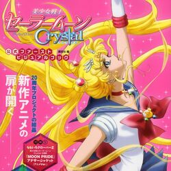 5 июля 2014,наконец, вышла первая серия новой экранизации «Сейлор Мун». Открывающей песней была вышеобозначенная «Moon Pride», закрывающей же – «Gekko». В июле, августе в журналах «Animedia» и «Animage» были опубликованы статьи, посвящённые новому аниме, а также по одному новому арту в каждом журнале, концепты, представленные в апреле, и скриншоты. Помимо этого, в журнале Animedia публиковались краткие синопсисы последующих серий, они носили названия, соответствующие актам манги.