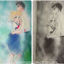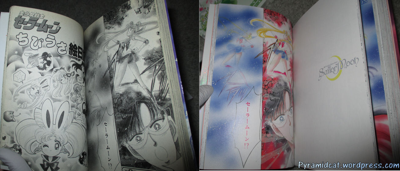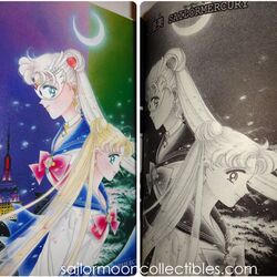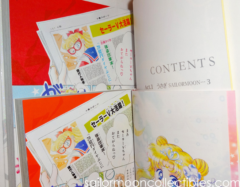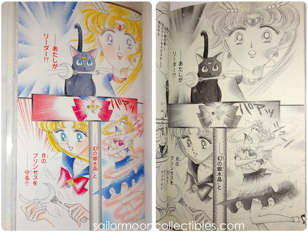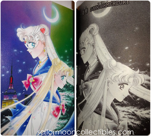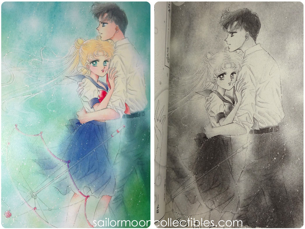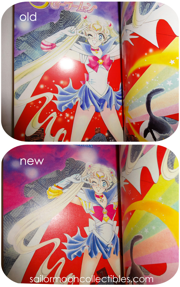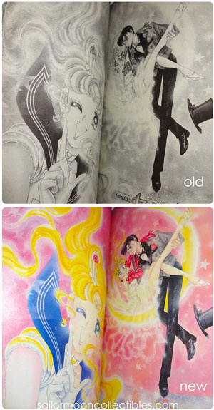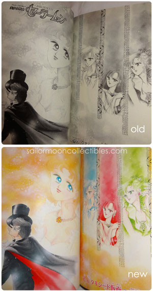 Почти все цветные иллюстрации, использовавшиеся в шинсобане, были включены в коллекционное издание, но с некоторыми поправками и улучшениями. Так, к примеру, на 1 странице 1 акта 1 тома были изменены цвета газетных шрифтов, а двойная титульная страница к 1 акту, перерисованная и использованная в шинсобане, была заменена на оригинальный вариант, помещённый в первом артбуке по СМ. Также в этом издании мы можем увидеть новые детали: к примеру, зонтик на титульной странице 5 акта – это зонтик, в который превратилась Маскирующая ручка Сейлор Мун, когда она и Такседо Маск упали с балкона. В этом издании каждый новый акт начинается с полноцветной страницы – одинарной или двойной; иногда присутствуют раскрашенные первые странички актов. Все эти иллюстрации прежде можно было увидеть на страницах “Nakayoshi” – журнала, в котором изначально и публиковалась СМ.