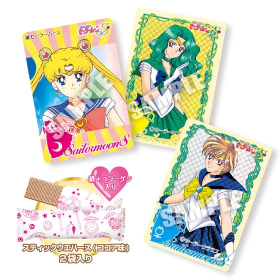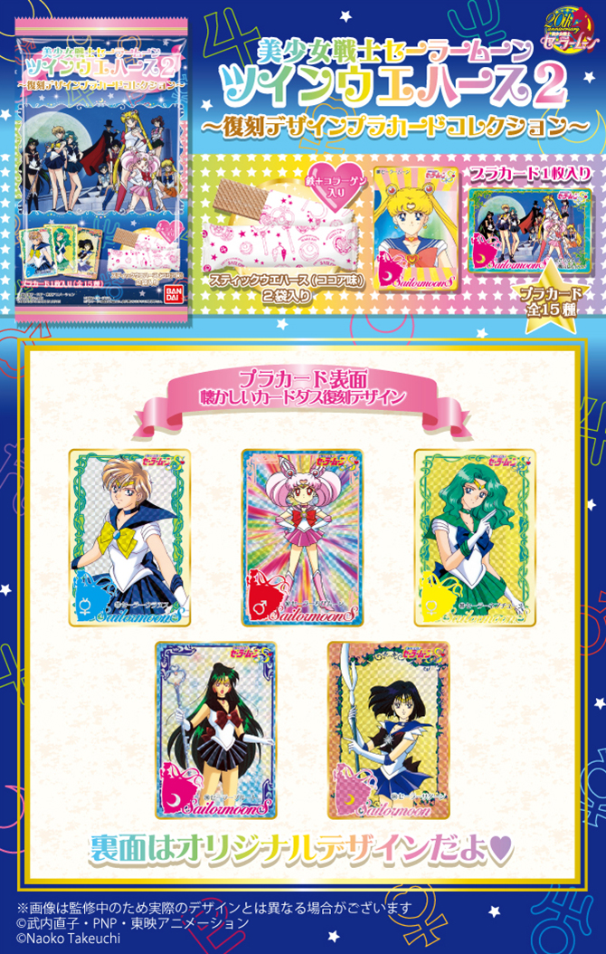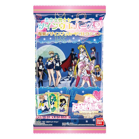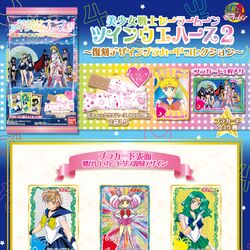 Компания "Bandai" анонсировала второй сет "Sailor Moon Twin Wafers with Plastic Cards". Как и первый сет, так и в этом наборе будет 15 коллекционных карточек, 7 из которых - голографические. Данные карточки - перепечатки карт 90-х, с иллюстрациями из 3 и 4 сезонов. На задней стороне каждой карточки - тексты песен из классического аниме. Вафли будут иметь аромат какао. Все вафли и карточки упакованы индивидуально, одна упаковка включает в себя 2 вафли и 1 карточку.