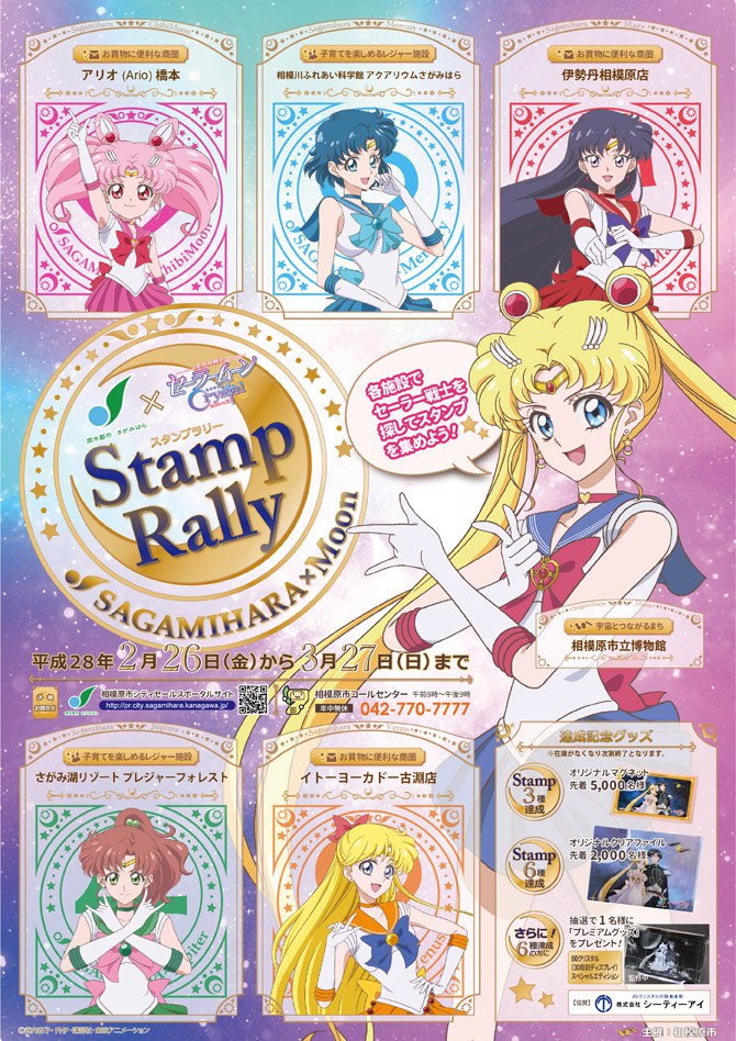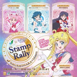 Вместе с этим, было объявлено о продолжении сотрудничества Sailor Moon с городом Сагамихара. На этот раз это будет Stamp Rally - штамп-квест по известным местам и заведениям города. Сроки проведения - с 26 февраля по 27 марта. Суть квеста заключается в следующем - участники должны будут посетить специальные места, указанные на карте, и собрать в специальный бланк 6 печатей, соответствующих одной из сейлор-воинов: