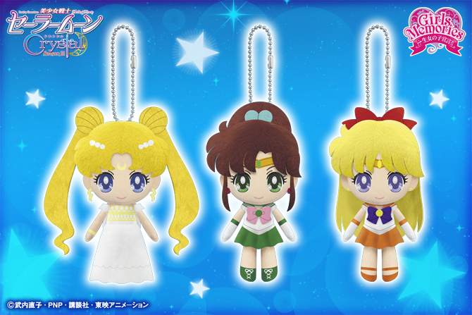 В преддверии старта 3 арки СМК, продолжается выпуск продукции, связанной с ней. Сегодня был анонсирован второй набор плюшевых чибиков-брелоков из серии "Sailor Moon Crystal Mascot Plush". В комплект входят: Принцесса Серенити, Сейлор Юпитер и Сейлор Венера. Все 3 выйдут с шариковыми цепями. Эти брелоки - часть продукции по 3 сезону СМК, что можно заметить по логотипу, и сделаны они компанией "Banpresto". Данные продукты будут загружены в крабы-автоматы в июле, в которых их и можно будет выиграть в аркаду. Высота каждого брелочка - 11 см.