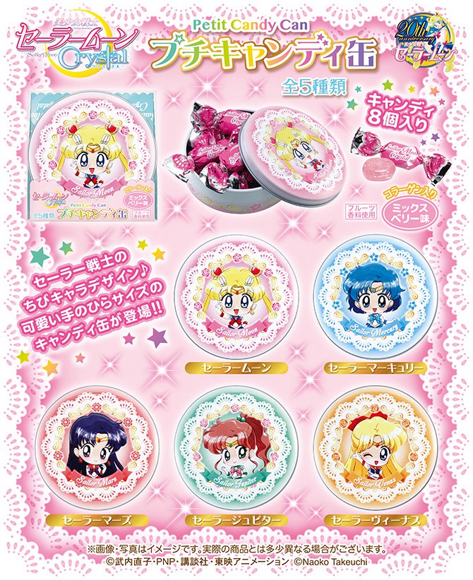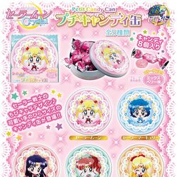Официальный сайт СМ объявил о выходе очередной продукции, связанной с ней. На сей раз, это - конфетки серии "Petit Candy". Всего к выходу запланировано 5 видов конфет, в небольших круглых коробочках с тиснением, по одной на каждую "внутреннюю воительницу" - Сейлор Мун, Сейлор Меркурий, Сейлор Марс, Сейлор Юпитер, Сейлор Венеру; сенши будут изображены в качестве чибиков, в стиле первых 2 арок СМК. В каждой коробочке будет по 8 конфет с ягодным вкусом.