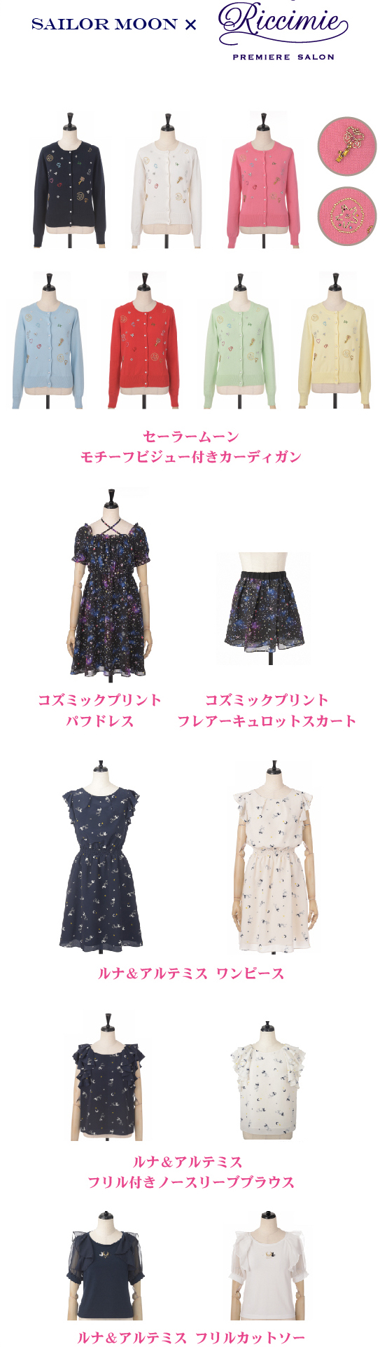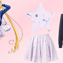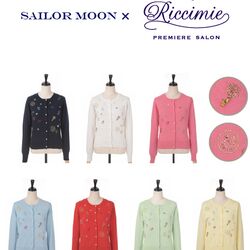 - Кардиганы на пуговицах "Sailor Senshi Cardigan": кардиганы, которые выйдут в 5 цветах - белом, синем, красном, зелёном и жёлтом. Подол каждого кардигана украшен шифоновыми оборками. Каждый из них имеет на месте пуговиц символ планеты или Кристальную звезду. Цена - 13 000 йен.