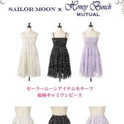 - Платья "Items Motif Pattern Cami Dress": платья с принтом, изображающим предметы для превращений из всех 5 сезонов. Лямки являются съёмными, поэтому данную вещь можно носить как юбку. Выйдет в 3 цветах - белом, чёрном и сиреневом. Цена - 19 000 йен.