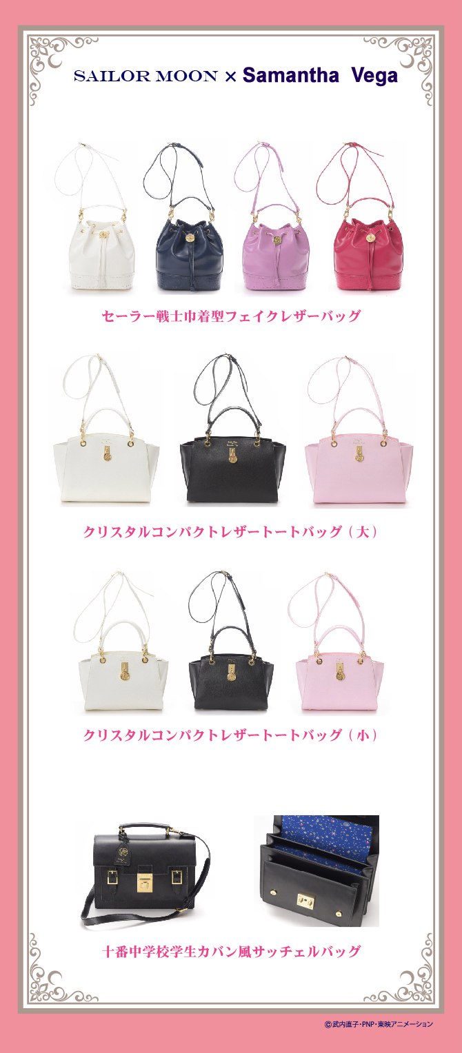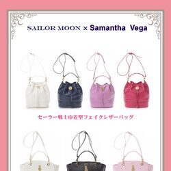- Сумка-портфель "Juuban Junior High Student Bag Style Satchel Bag": кожаная сумка, чей дизайн схож со школьной сумкой Усаги; много внимания уделено деталям - ярлык с золотистым изображением Кристальной Звезды и надписями "Sailor Moon х Samantha Vega", такая же гравировка на замке и т.д. Эту сумку можно носить как в руках, так и на плече, с помощью прилагающегося ремешка. Её размеры - 26 см. х 12,5 см. х 19 см. Розничная цена за сумку - 59 000 йен.