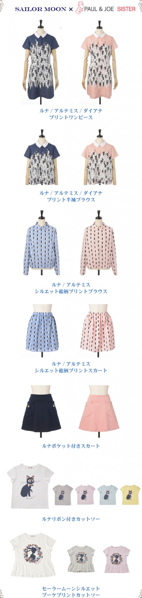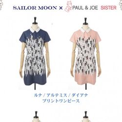- Платье "Luna, Artemis, Diana Print Dress": платье с белым воротником и короткими рукавами; выйдет в 2 видах - тёмно-синем и розовом. Принт - множество фигур Луны и Артемиса. Будет доступно в размерах "S" и "M". Цена каждого платья - 36 000 йен.