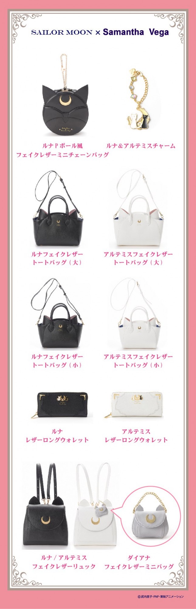 - Сумки "Luna/Artemis Faux Leather Tote Bag Large" & "Luna/Artemis Faux Leather Tote Bag Small": весёлые сумки, по дизайну похожие на лунных кошек. Сделаны из синтетической кожи, а задняя часть "ушей" у этих сумок имеет розовую замшевую подкладку. В центре - золотистые металлические полумесяцы, какие были на лбах лунных кошек. Внутренняя часть аналогична сумке с Луной-Пи. Выйдут в чёрном и белом цветах соответственно. Как и сумки с застёжками в форме Кристальной броши, выйдут в большом и маленьком форматах. Размеры больших сумок - 31,8 см. х 13,8 см. х 22 см.; маленьких 26 см. х 11,8 см. х 17, 5 см. Розничная цена первых (больших) сумок - 26 000 йен; вторых (маленьких) - 23 000 йен.