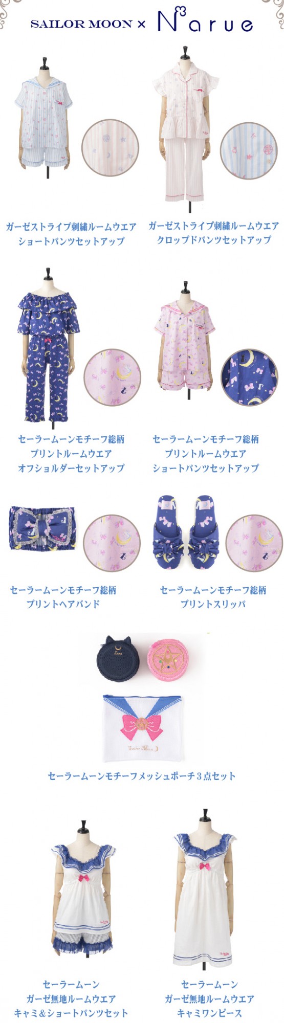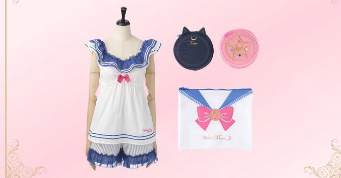 - Пижама "Stripe Embroidery Shorts Set": пижама, состоящая из коротких шорт и рубашки с удлинёнными рукавами и воротником-матроской; бело-голубого/бело-розового цвета, в полоску с узором из брошей, знаков планет, звёзд, полумесяцев. С левой стороны рубашки имеется небольшой кармашек, ближе к краю верха и шорт нашит ярко-розовый логотип "Sailor Moon". Стоимость - 9000 йен за комплект.