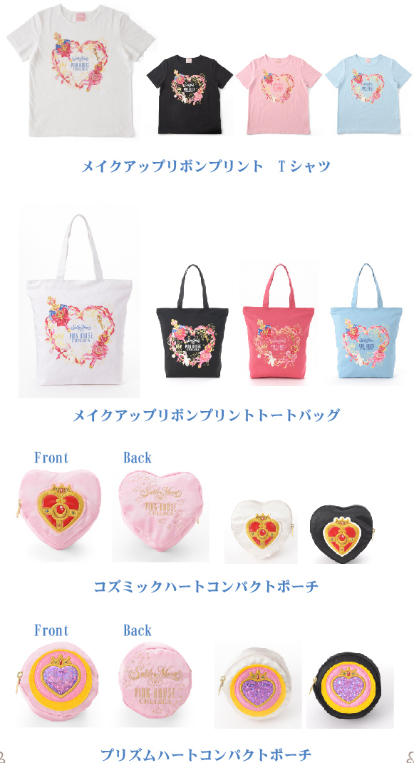 - Косметичка "Prism Heart Compact Pouch": косметичка круглой формы. Спереди изображена брошь Сейлор Чибимун из 3 сезона, сзади - надпись "Sailor Moon Pink House Chelsea". Выйдет в 3 цветах - розовом, белом и чёрном. Размеры - 10 см. х 5,5 см. Цена - 7500 йен.