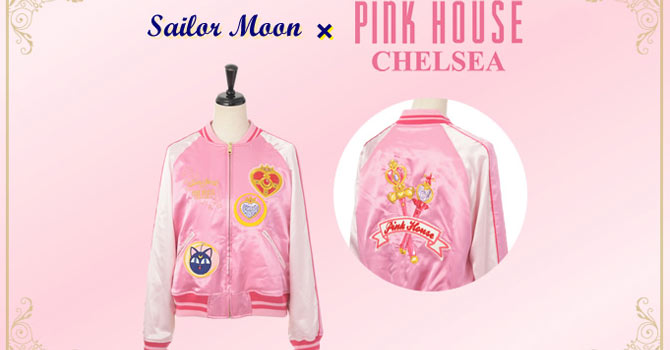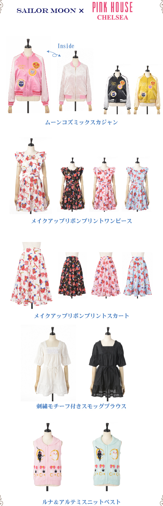 - Двусторонние ветровки "Moon Cosmic Sukajan Jacket": ветровки с принтами и вышивкой. На левой стороне изображены броши СМ и Сейлор Чибимун из 3 сезона, на правой - Луна-Пи и вышитая надпись "Sailor Moon Pink House Chelsea". На спине - жезлы СМ и Чибимун из 3 сезона и надписью в ленте "Pink House".Ветровка - двусторонняя, другая сторона сделана из велюра. Выйдет в 3 цветах - розовом, чёрном и жёлтом. Доступна в размерах S и M. Цена за ветровку - 38 000 йен.