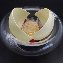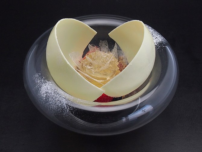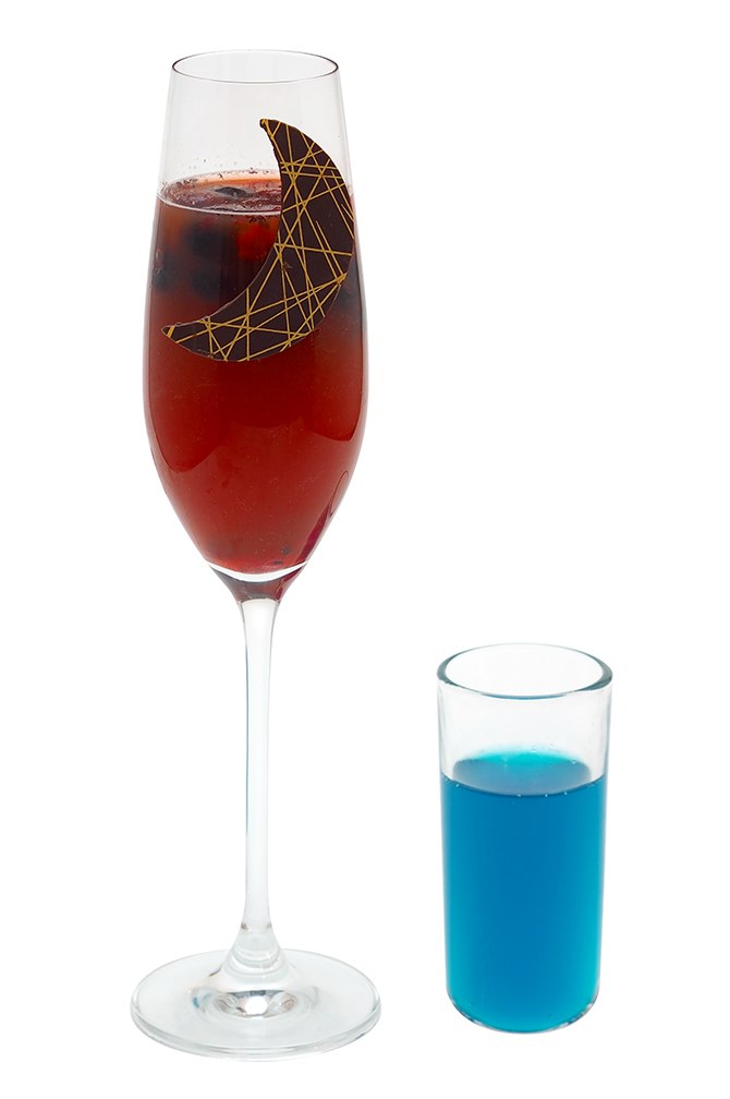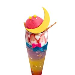 - Sky Miracle Romance: парфе с главной темой с арта выставки - полумесяца и закатного неба. Начинка - белый шоколадный крем, мороженное, бисквит, цветное желейный шербет (мотив неба) и клубника. Украшено парфе полумесяцем, выполненным, по всей видимости, из из шоколада. Цена - 1250 йен.